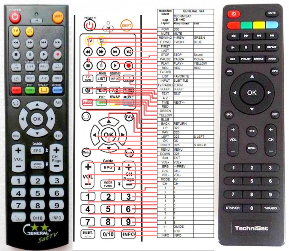 Náhradní dálkový ovladač TECHNISAT CE4 HD - 100procent náhrada 1:1 za originální dálkový ovladač. Dálkový ovladač je určen pro tyto modely TECHNISAT: CE 4HD, CE4 HD, CE4HD. (Nemusí zde být uvedeny úplně všechny kompatibilní modely. Pokud si nejste jisti, sdělte nám svůj model (použijte online chat, e-mail, telefon), neprodleně zkontrolujeme a ověříme, zda je tento ovladač kompatibilní s Vaším přístrojem. Za poskytnutou informaci ručíme.) Ovladač je dodáván ve verzi značkového dálkového ovladače General SAT/TV (zobrazen vlevo). Garantujeme Vám, že dostanete ovladač, který plně nahradí Váš původní originální ovladač a bude mít naprosto všechny funkce. Není to univerzální ovladač, ale ovladač, který je naprogramován a přímo určen pro modely přístrojů uvedené výše. Není třeba žádné párování, žádné kódy. Obdržíte od nás ovladač, který je připraven k použití - jediné, co musíte udělat, je vložit baterie a ovladač hned funguje. Podívejte se na obrázek ovladače a ujistěte se, že jsou v tabulce všechny funkce jako na původním originálním ovladači. Jedná se o plnohodnotný náhradní dálkový ovladač (není to „univerzál“). Má naprosto všechny funkce přesně jako originální ovladač. Záruční lhůta na ovladač je 2 roky. Dodáván také jednoduchý návod s mapováním funkcí. DOPLŇKOVÁ FUNKCE: Tento dálkový ovladač je možno naprogramovat na 1 další přístroj. Budete moci jedním ovladačem ovládat oba přístroje (např. SAT plus TV nebo SAT plus DVD apod). Pokud nám do komentáře v objednávce napíšete model dalšího přístroje, naprogramujeme Vám ovladač na oba. Za tuto doplňkovou službu bude naúčtován příplatek k ceně ovladače 50 Kč: více informací