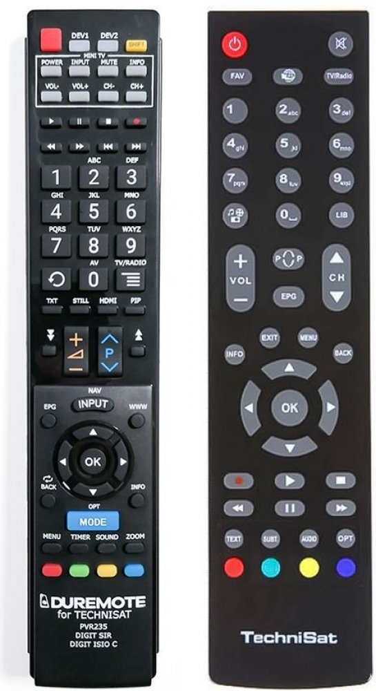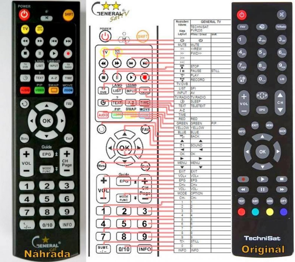 Dálkový ovladač TECHNISAT DIGIT SIR duplikát 1:1 originálního dálkového ovladače. Dálkový ovladač je určen pro tyto modely TECHNISAT: DIGIT SIR. (Nemusí zde být uvedeny úplně všechny kompatibilní modely. Pokud si nejste jisti, sdělte nám svůj model (použijte online chat, e-mail, telefon), neprodleně zkontrolujeme a ověříme, zda je tento ovladač kompatibilní s Vaším přístrojem. Za poskytnutou informaci ručíme.) Dálkový ovladač General Duremote má naprosto všechny funkce a popisky tlačítek stejné jako originální dálkový ovladač. Není třeba nic nastavovat, žádné kódy, funguje ihned po vložení baterií se všemi výše uvedenými modely. Ovladač je dodáván ve verzi značkového dálkového ovladače General Duremote (zobrazen vlevo) Jedná se o ovladač vyrobený pro specifické zařízení – NENÍ to univerzální ovladač! Má naprosto všechny funkce jako originální dálkový ovladač. Má stejné popisky tlačítek, jako jste byli zvyklí z originálu. Popisky tlačítek jsou velmi odolné a nejdou seškrábat ani hrubou silou. 2 roky záruka. General Duremote byl navržen a vyroben přesně podle originálního dálkového ovladače tlačítko po tlačítku. Ovladač je vyvinut a testován v České republice a podléhá CE a ROHS standardům. SNADNÉ INTUITIVNÍ POUŽÍVÁNÍ: Na rozdíl od běžných náhradních ovladačů, General Duremote má 100procent odpovídající popisky tlačítek jako na originálním ovladači. Srovnání: Jiné univerzální nebo programovatelné náhrady mají kvůli snížení nákladů názvy/popisky a rozložení tlačítek univerzální, popisky tlačítek často neodpovídají funkci tlačítka a vyžadují tedy návody k použití. To často vede k nejasnostem, co které tlačítko dělá a stálá potřeba manuálu je velmi obtěžující. S ovladačem General Duremote žádný návod nepotřebujete, tlačítko dělá přesně to, co symbolizuje jeho popisek. GARANTUJEME 100procent FUNKČNOST: Narozdíl od jiných náhrad je každý dálkový ovladač General Duremote přímo v naší firmě navržen a testován na míru pro konkrétní zařízení tak, aby každé tlačítko odpovídalo funkci tlačítka originálního ovladače. Díky tomu můžeme zaručit 100procent funkčnost přesně jako originální ovladač. Samotné šasi bylo navrženo a vyvíjeno tak, aby bylo co nejodolnější a nejspolehlivější. Zároveň však byl kladen důraz na přívětivé rozložení tlačítek a popisky tlačítek jsou optimalizovány pro dobrou viditelnost. Materiály a součástky byly podrobeny důkladným testům, aby odolaly i tomu nejtvrdšímu zacházení a poskytovaly tak dlouhodobou životnost. Názvy tlačítek jsou na ovladači natištěny moderní technologií v naší firmě (naše vlastní know-how). Tisk je extrémně odolný a nelze jej setřít ani oškrábat. DUPLIKÁT originálního dálkového ovladače má naprosto stejné funkce a stejné názvy tlačítek jako Váš původní originální ovladač. Nemusíte nic nastavovat, po vložení baterií bude okamžitě fungovat, ovladač je již nakonfigurován tak, aby fungoval na modely uvedené výše. Nápisy na tlačítkách přesně odpovídají funkcím tlačítek, tiskneme je přesně podle originálního ovladače. Narozdíl od všech univerzálních a programovatelných náhrad, kde jsou názvy tlačítek univerzální a pro uživatele matoucí. Popisky jsou natištěny technicky vyspělou technologií v naší provozovně (naše know-how), jsou extrémně odolné, nejdou setřít ani seškrábat (např. nehtem). Opravdu jsme schopni vyrobit jakýkoliv dálkový ovladač! Splníme i požadavky na exotické ovladače, které nejsou (zatím) v naší nabídce. DUPLIKÁT = Nejlepší poměr cena/výkon. DOPORUČUJEME! DUPLIKÁT originálního dálkového ovladače má naprosto stejné funkce a stejné názvy tlačítek jako Váš původní originální ovladač. Nemusíte nic nastavovat, po vložení baterií bude okamžitě fungovat, ovladač je již nakonfigurován tak, aby fungoval na modely uvedené níže. Nápisy na tlacitkach přesně odpovídají funkcím tlačítek, tiskneme je přesně podle oriignálního ovladače. Narozdil od všech univerzalnich a programovatelnych náhrad, kde jsou názvy tlačítek univerzální a pro uživatele matoucí. Popisky jsou natištěny technicky vyspělou technologií v naší provozovně (naše know-how), jsou extrémně odolné, nejdou setřít ani seškrábat (např.nehtem). Opravdu jsme schopni vyrobit jakýkoliv dálkový ovladač! Splníme i požadavky na exotické ovladače, které nejsou (zatím :) v naší nabídce. DUPLIKÁT = Nejlepší poměr cena/výkon. DOPORUČUJEME!