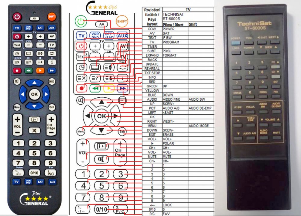 Náhradní dálkový ovladač TECHNISAT ST-6000S (ST6000S) - 100% náhrada 1:1 za originální dálkový ovladač. Dálkový ovladač byl vyvinut speciálně na míru pro tyto modely značky TECHNISAT:ST-6000S, ST6000S. (Nemusí zde být uvedeny úplně všechny kompatibilní modely. Pokud si nejste jisti, sdělte nám svůj model (použijte online chat, e-mail, telefon), neprodleně zkontrolujeme a ověříme, zda je tento ovladač kompatibilní s Vaším přístrojem. Za poskytnutou informaci ručíme.) Ovladač je dodáván ve verzi značkového dálkového ovladače General Premium (zobrazen vlevo). Garantujeme Vám, že dostanete ovladač, který plně nahradí Váš původní originální ovladač a bude mít naprosto všechny funkce stejné.Není to univerzální ovladač, ale ovladač, který je naprogramován a přímo určen pro modely přístrojů uvedené výše. Není třeba žádné párování, žádné kódy. Obdržíte od nás ovladač, který je připraven k použití - jediné, co musíte udělat, je vložit baterie a ovladač hned funguje. Podívejte se na obrázek ovladače a ujistěte se, že jsou v tabulce všechny funkce jako na původním originálním ovladači. Jedná se o plnohodnotný náhradní dálkový ovladač (není to „univerzál“). Má naprosto všechny funkce přesně jako originální ovladač. Záruční lhůta na ovladač je 3 roky. Dodáván také jednoduchý návod s mapováním funkcí. DOPLŇKOVÁ FUNKCE: Tento dálkový ovladač je možno naprogramovat na 1-4 zařízení (celkem tedy 4). Budete moci jedním ovladačem ovládat několik různých přístrojů jedním ovladačem. Pokud nám do komentáře v objednávce napíšete modely dalších přístrojů, naprogramujeme Vám ovladač na všechny. Za tuto doplňkovou službu bude naúčtován příplatek k ceně ovladače 50 Kč: více informacíV případě, že v budoucnu vyměníte/obměníte Vaši domácí elektroniku, jsme schopni Vám tento ovladač přeprogramovat na naprosto jakékoliv nové/á zařízení. Ovladač General přežije Váš stávající přístroj!