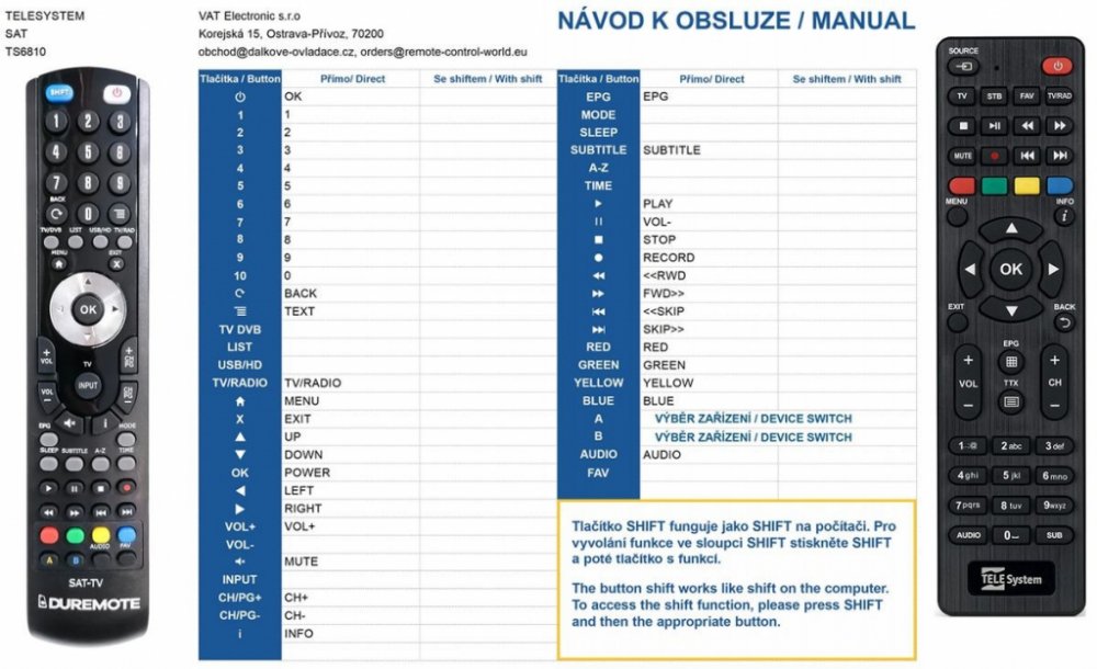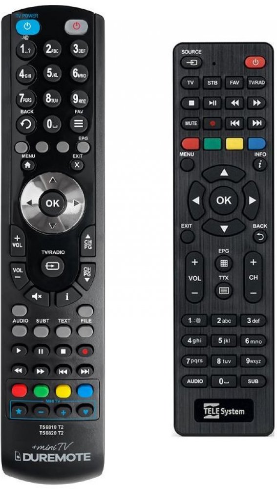 Náhradní dálkový ovladač TELESYSTEM TS6810 T2 STEALTH - 100% náhrada 1:1 za originální dálkový ovladač. Dálkový ovladač byl vyvinut speciálně na míru pro tyto modely značky TELESYSTEM:TS-6810, TS-6812, TS6810, TS6810 T2 STEALTH, TS6810T2 STEALTH, TS6812, TS6812 T2, TS6812T2 HEVC. (Nemusí zde být uvedeny úplně všechny kompatibilní modely. Pokud si nejste jisti, sdělte nám svůj model (použijte online chat, e-mail, telefon), neprodleně zkontrolujeme a ověříme, zda je tento ovladač kompatibilní s Vaším přístrojem. Za poskytnutou informaci ručíme.) Ovladač je dodáván ve verzi značkového dálkového ovladače General Duremote (zobrazen vlevo). Garantujeme Vám, že dostanete ovladač, který plně nahradí Váš původní originální ovladač a bude mít naprosto všechny funkce stejné.Není to univerzální ovladač, ale ovladač, který je naprogramován a přímo určen pro modely přístrojů uvedené výše. Není třeba žádné párování, žádné kódy. Obdržíte od nás ovladač, který je připraven k použití - jediné, co musíte udělat, je vložit baterie a ovladač hned funguje. Podívejte se na obrázek ovladače a ujistěte se, že jsou v tabulce všechny funkce jako na původním originálním ovladači. Jedná se o plnohodnotný náhradní dálkový ovladač (není to „univerzál“). Má naprosto všechny funkce přesně jako originální ovladač. Záruční lhůta na ovladač je 3 roky. Dodáván také jednoduchý návod s mapováním funkcí. DOPLŇKOVÁ FUNKCE: Tento dálkový ovladač je možno naprogramovat na 1 další přístroj. Budete moci jedním ovladačem ovládat oba přístroje. Pokud nám do komentáře v objednávce napíšete model dalšího přístroje, naprogramujeme Vám ovladač na oba. Za tuto doplňkovou službu bude naúčtován příplatek k ceně ovladače 50 Kč: více informací