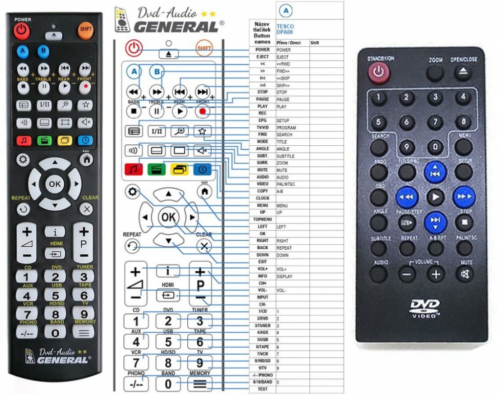 Náhradní dálkový ovladač TESCO DPA08 - 100% náhrada 1:1 za originální dálkový ovladač. Dálkový ovladač byl vyvinut speciálně na míru pro tyto modely značky TESCO:DPA08. (Nemusí zde být uvedeny úplně všechny kompatibilní modely. Pokud si nejste jisti, sdělte nám svůj model (použijte online chat, e-mail, telefon), neprodleně zkontrolujeme a ověříme, zda je tento ovladač kompatibilní s Vaším přístrojem. Za poskytnutou informaci ručíme.) Ovladač je dodáván ve verzi značkového dálkového ovladače General DVD/AUDIO (zobrazen vlevo). Garantujeme Vám, že dostanete ovladač, který plně nahradí Váš původní originální ovladač a bude mít naprosto všechny funkce stejné.Není to univerzální ovladač, ale ovladač, který je naprogramován a přímo určen pro modely přístrojů uvedené výše. Není třeba žádné párování, žádné kódy. Obdržíte od nás ovladač, který je připraven k použití - jediné, co musíte udělat, je vložit baterie a ovladač hned funguje. Podívejte se na obrázek ovladače a ujistěte se, že jsou v tabulce všechny funkce jako na původním originálním ovladači. Jedná se o plnohodnotný náhradní dálkový ovladač (není to „univerzál“). Má naprosto všechny funkce přesně jako originální ovladač. Záruční lhůta na ovladač je 3 roky. Dodáván také jednoduchý návod s mapováním funkcí. DOPLŇKOVÁ FUNKCE: Tento dálkový ovladač je možno naprogramovat na 1 další přístroj. Budete moci jedním ovladačem ovládat oba přístroje (např. DVD+TV nebo SOUNDBAR+TV apod.). Pokud nám do komentáře v objednávce napíšete model dalšího přístroje, naprogramujeme Vám ovladač na oba. Za tuto doplňkovou službu bude naúčtován příplatek k ceně ovladače 50 Kč: více informací