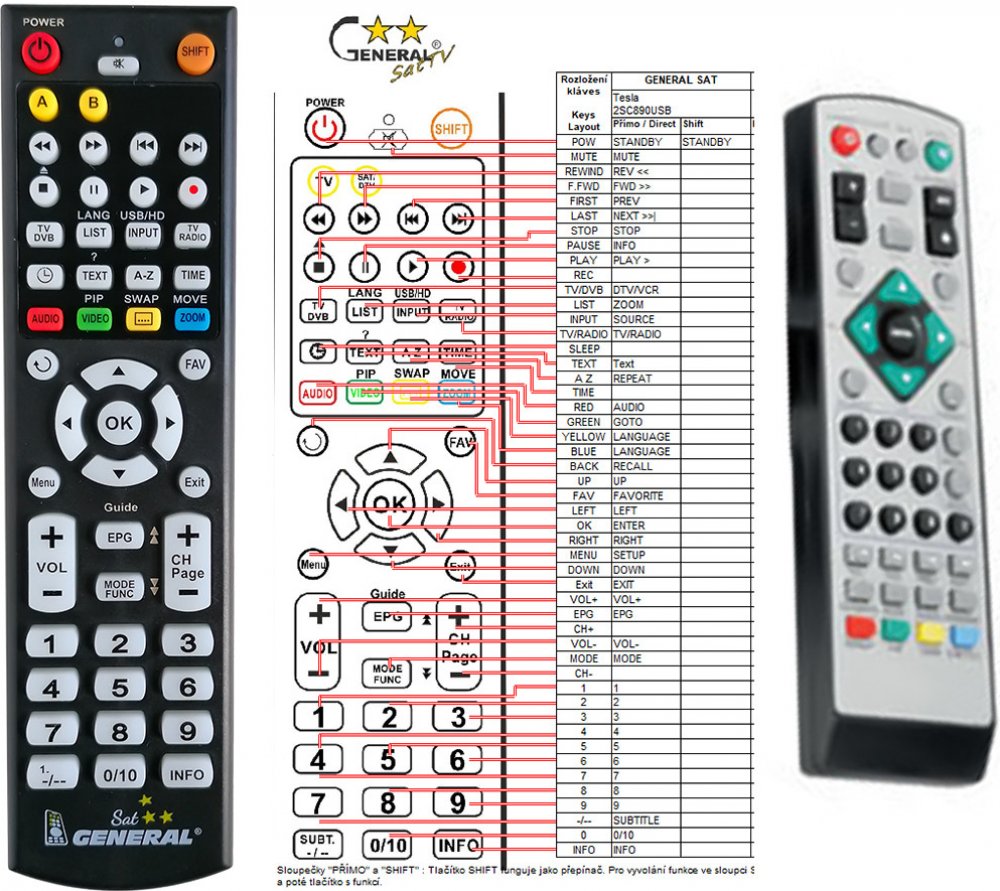 Náhradní dálkový ovladač TESLA DVB-T 2SC890 (DVBT 2SC890) - 100% náhrada 1:1 za originální dálkový ovladač. Dálkový ovladač byl vyvinut speciálně na míru pro tyto modely značky TESLA:2SC890, 2SC890USB. (Nemusí zde být uvedeny úplně všechny kompatibilní modely. Pokud si nejste jisti, sdělte nám svůj model (použijte online chat, e-mail, telefon), neprodleně zkontrolujeme a ověříme, zda je tento ovladač kompatibilní s Vaším přístrojem. Za poskytnutou informaci ručíme.) Ovladač je dodáván ve verzi značkového dálkového ovladače General SAT/TV (zobrazen vlevo). Garantujeme Vám, že dostanete ovladač, který plně nahradí Váš původní originální ovladač a bude mít naprosto všechny funkce stejné.Není to univerzální ovladač, ale ovladač, který je naprogramován a přímo určen pro modely přístrojů uvedené výše. Není třeba žádné párování, žádné kódy. Obdržíte od nás ovladač, který je připraven k použití - jediné, co musíte udělat, je vložit baterie a ovladač hned funguje. Podívejte se na obrázek ovladače a ujistěte se, že jsou v tabulce všechny funkce jako na původním originálním ovladači. Jedná se o plnohodnotný náhradní dálkový ovladač (není to „univerzál“). Má naprosto všechny funkce přesně jako originální ovladač. Záruční lhůta na ovladač je 3 roky. Dodáván také jednoduchý návod s mapováním funkcí. DOPLŇKOVÁ FUNKCE: Tento dálkový ovladač je možno naprogramovat na 1 další přístroj. Budete moci jedním ovladačem ovládat oba přístroje (např. SAT+TV nebo SAT+DVD apod). Pokud nám do komentáře v objednávce napíšete model dalšího přístroje, naprogramujeme Vám ovladač na oba. Za tuto doplňkovou službu bude naúčtován příplatek k ceně ovladače 50 Kč: více informací