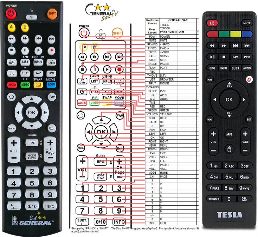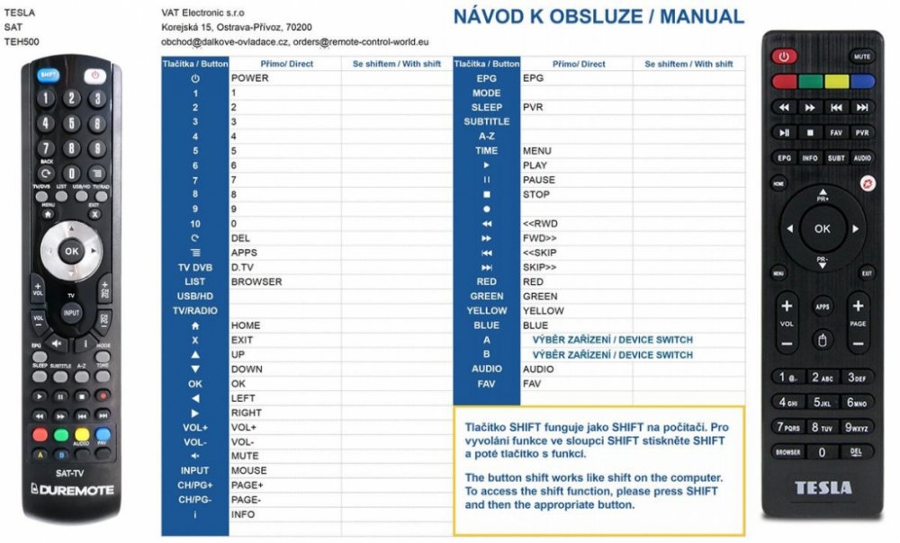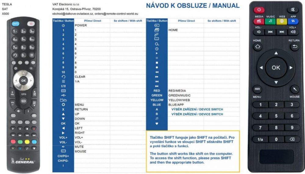 Náhradní dálkový ovladač TESLA MEDIABOX QX4 - 100procent náhrada 1:1 za originální dálkový ovladač. Dálkový ovladač je určen pro tyto modely TESLA: MEDIABOX QX4, QX4, QX8PRO, X300, X500. (Nemusí zde být uvedeny úplně všechny kompatibilní modely. Pokud si nejste jisti, sdělte nám svůj model (použijte online chat, e-mail, telefon), neprodleně zkontrolujeme a ověříme, zda je tento ovladač kompatibilní s Vaším přístrojem. Za poskytnutou informaci ručíme.) Ovladač je dodáván ve verzi značkového dálkového ovladače General SAT/TV (zobrazen vlevo). Garantujeme Vám, že dostanete ovladač, který plně nahradí Váš původní originální ovladač a bude mít naprosto všechny funkce. Není to univerzální ovladač, ale ovladač, který je naprogramován a přímo určen pro modely přístrojů uvedené výše. Není třeba žádné párování, žádné kódy. Obdržíte od nás ovladač, který je připraven k použití - jediné, co musíte udělat, je vložit baterie a ovladač hned funguje. Podívejte se na obrázek ovladače a ujistěte se, že jsou v tabulce všechny funkce jako na původním originálním ovladači. Jedná se o plnohodnotný náhradní dálkový ovladač (není to „univerzál“). Má naprosto všechny funkce přesně jako originální ovladač. Záruční lhůta na ovladač je 2 roky. Dodáván také jednoduchý návod s mapováním funkcí. DOPLŇKOVÁ FUNKCE: Tento dálkový ovladač je možno naprogramovat na 1 další přístroj. Budete moci jedním ovladačem ovládat oba přístroje (např. SAT plus TV nebo SAT plus DVD apod). Pokud nám do komentáře v objednávce napíšete model dalšího přístroje, naprogramujeme Vám ovladač na oba. Za tuto doplňkovou službu bude naúčtován příplatek k ceně ovladače 50 Kč: více informací