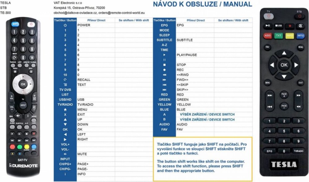 Náhradní dálkový ovladač TESLA TE-300, TE-301, TE-302 (TE300, TE301, TE302) - 100% náhrada 1:1 za originální dálkový ovladač. Dokonalá 1:1 kopie navržená a vyrobená naší firmou – má všechny funkce originálního ovladače pro tyto modely značky TESLA:TE 300, TE 301, TE 302, TE 303, TE-300, TE-301, TE-302, TE300, TE301, TE302. (Nemusí zde být uvedeny úplně všechny kompatibilní modely. Pokud si nejste jisti, sdělte nám svůj model (použijte online chat, e-mail, telefon), neprodleně zkontrolujeme a ověříme, zda je tento ovladač kompatibilní s Vaším přístrojem. Za poskytnutou informaci ručíme.) Ovladač je dodáván ve verzi značkového dálkového ovladače General Duremote (zobrazen vlevo). Garantujeme Vám, že dostanete ovladač, který plně nahradí Váš původní originální ovladač a bude mít naprosto všechny funkce stejné.Není to univerzální ovladač, ale ovladač, který je naprogramován a přímo určen pro modely přístrojů uvedené výše. Není třeba žádné párování, žádné kódy. Obdržíte od nás ovladač, který je připraven k použití - jediné, co musíte udělat, je vložit baterie a ovladač hned funguje. Podívejte se na obrázek ovladače a ujistěte se, že jsou v tabulce všechny funkce jako na původním originálním ovladači. Jedná se o plnohodnotný náhradní dálkový ovladač (není to „univerzál“). Má naprosto všechny funkce přesně jako originální ovladač. Záruční lhůta na ovladač je 3 roky. Dodáván také jednoduchý návod s mapováním funkcí. DOPLŇKOVÁ FUNKCE: Tento dálkový ovladač je možno naprogramovat na 1 další přístroj. Budete moci jedním ovladačem ovládat oba přístroje. Pokud nám do komentáře v objednávce napíšete model dalšího přístroje, naprogramujeme Vám ovladač na oba. Za tuto doplňkovou službu bude naúčtován příplatek k ceně ovladače 50 Kč: více informací