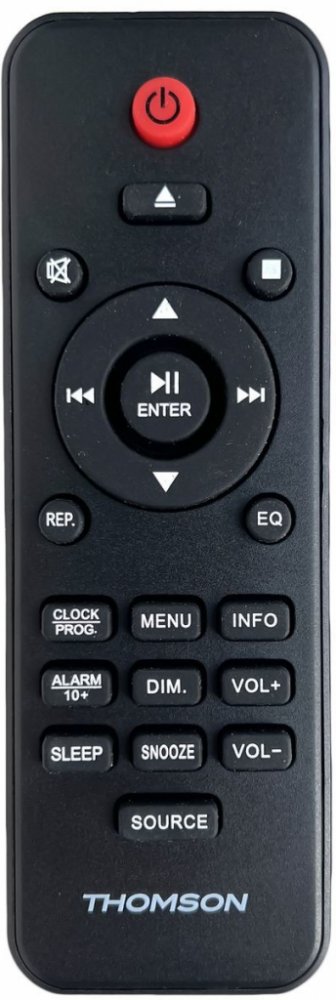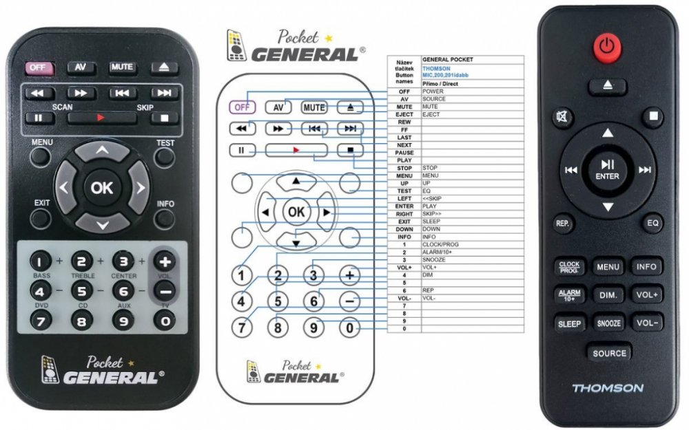 Náhradní dálkový ovladač THOMSON MIC201IDABBT, MIC200IDABBT, MIC205IDABBT - 100% náhrada 1:1 za originální dálkový ovladač. Dálkový ovladač byl vyvinut speciálně na míru pro tyto modely značky THOMSON:MIC200IDABBT, MIC201IDABBT, MIC205IDABBT. (Nemusí zde být uvedeny úplně všechny kompatibilní modely. Pokud si nejste jisti, sdělte nám svůj model (použijte online chat, e-mail, telefon), neprodleně zkontrolujeme a ověříme, zda je tento ovladač kompatibilní s Vaším přístrojem. Za poskytnutou informaci ručíme.) Ovladač je dodáván ve verzi značkového dálkového ovladače General POCKET (zobrazen vlevo). Garantujeme Vám, že dostanete ovladač, který plně nahradí Váš původní originální ovladač a bude mít naprosto všechny funkce stejné.Není to univerzální ovladač, ale ovladač, který je naprogramován a přímo určen pro modely přístrojů uvedené výše. Není třeba žádné párování, žádné kódy. Obdržíte od nás ovladač, který je připraven k použití - jediné, co musíte udělat, je vložit baterie a ovladač hned funguje. Podívejte se na obrázek ovladače a ujistěte se, že jsou v tabulce všechny funkce jako na původním originálním ovladači. Jedná se o plnohodnotný náhradní dálkový ovladač (není to „univerzál“). Má naprosto všechny funkce přesně jako originální ovladač. Záruční lhůta na ovladač je 3 roky. Dodáván také jednoduchý návod s mapováním funkcí.