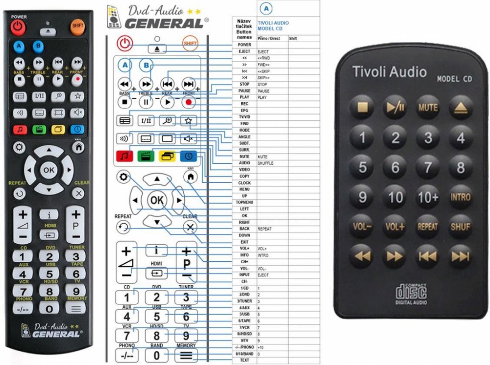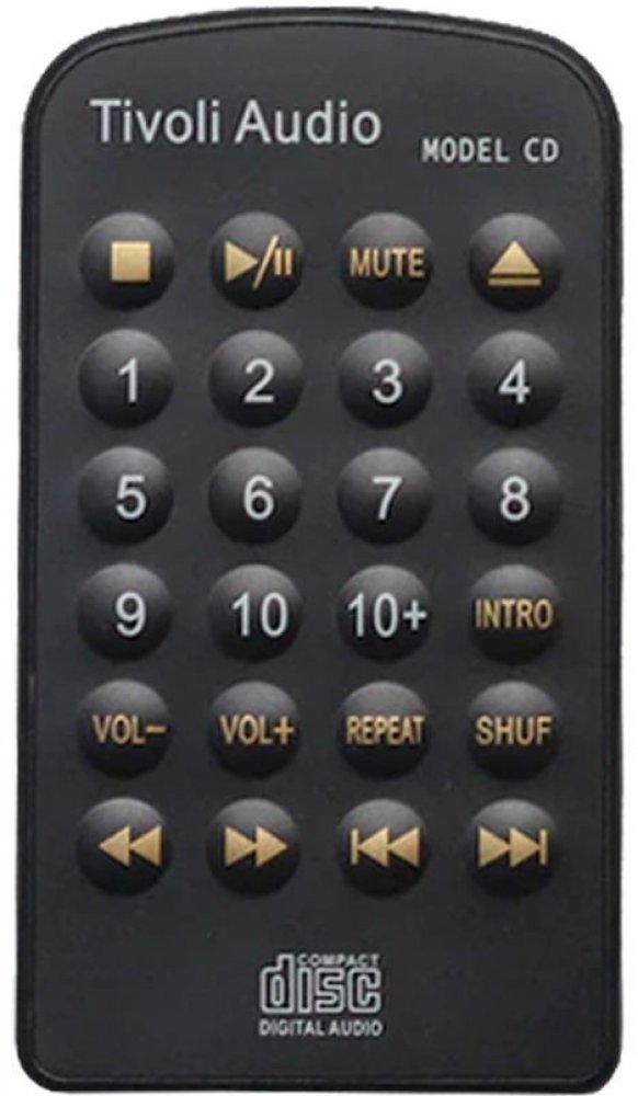 Náhradní dálkový ovladač TIVOLI AUDIO Model CD - 100% náhrada 1:1 za originální dálkový ovladač. Dokonalá 1:1 kopie navržená a vyrobená naší firmou – má všechny funkce originálního ovladače pro tyto modely značky TIVOLI AUDIO:MODEL CD. (Nemusí zde být uvedeny úplně všechny kompatibilní modely. Pokud si nejste jisti, sdělte nám svůj model (použijte online chat, e-mail, telefon), neprodleně zkontrolujeme a ověříme, zda je tento ovladač kompatibilní s Vaším přístrojem. Za poskytnutou informaci ručíme.) Ovladač je dodáván ve verzi značkového dálkového ovladače General DVD/AUDIO (zobrazen vlevo). Garantujeme Vám, že dostanete ovladač, který plně nahradí Váš původní originální ovladač a bude mít naprosto všechny funkce stejné.Není to univerzální ovladač, ale ovladač, který je naprogramován a přímo určen pro modely přístrojů uvedené výše. Není třeba žádné párování, žádné kódy. Obdržíte od nás ovladač, který je připraven k použití - jediné, co musíte udělat, je vložit baterie a ovladač hned funguje. Podívejte se na obrázek ovladače a ujistěte se, že jsou v tabulce všechny funkce jako na původním originálním ovladači. Jedná se o plnohodnotný náhradní dálkový ovladač (není to „univerzál“). Má naprosto všechny funkce přesně jako originální ovladač. Záruční lhůta na ovladač je 3 roky. Dodáván také jednoduchý návod s mapováním funkcí. DOPLŇKOVÁ FUNKCE: Tento dálkový ovladač je možno naprogramovat na 1 další přístroj. Budete moci jedním ovladačem ovládat oba přístroje (např. DVD+TV nebo SOUNDBAR+TV apod.). Pokud nám do komentáře v objednávce napíšete model dalšího přístroje, naprogramujeme Vám ovladač na oba. Za tuto doplňkovou službu bude naúčtován příplatek k ceně ovladače 50 Kč: více informací
