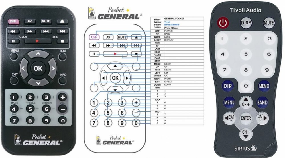 Náhradní dálkový ovladač TIVOLI AUDIO Model Satellite Sirius - 100% náhrada 1:1 za originální dálkový ovladač. Dálkový ovladač byl vyvinut speciálně na míru pro tyto modely značky TIVOLI AUDIO:MODEL SATELLITE SIRIUS. (Nemusí zde být uvedeny úplně všechny kompatibilní modely. Pokud si nejste jisti, sdělte nám svůj model (použijte online chat, e-mail, telefon), neprodleně zkontrolujeme a ověříme, zda je tento ovladač kompatibilní s Vaším přístrojem. Za poskytnutou informaci ručíme.) Ovladač je dodáván ve verzi značkového dálkového ovladače General POCKET (zobrazen vlevo). Garantujeme Vám, že dostanete ovladač, který plně nahradí Váš původní originální ovladač a bude mít naprosto všechny funkce stejné.Není to univerzální ovladač, ale ovladač, který je naprogramován a přímo určen pro modely přístrojů uvedené výše. Není třeba žádné párování, žádné kódy. Obdržíte od nás ovladač, který je připraven k použití - jediné, co musíte udělat, je vložit baterie a ovladač hned funguje. Podívejte se na obrázek ovladače a ujistěte se, že jsou v tabulce všechny funkce jako na původním originálním ovladači. Jedná se o plnohodnotný náhradní dálkový ovladač (není to „univerzál“). Má naprosto všechny funkce přesně jako originální ovladač. Záruční lhůta na ovladač je 3 roky. Dodáván také jednoduchý návod s mapováním funkcí.