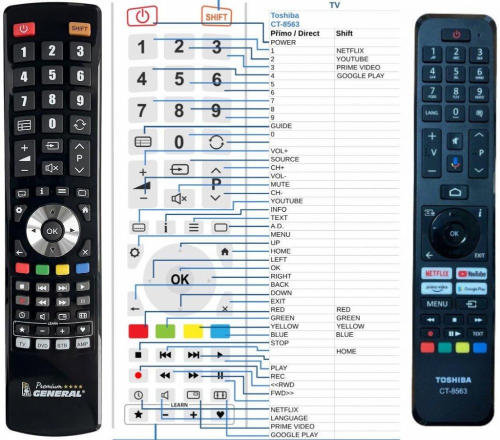 Náhradní dálkový ovladač TOSHIBA CT-8563 (CT8563) - 100% náhrada 1:1 za originální dálkový ovladač. Dokonalá 1:1 kopie navržená a vyrobená naší firmou – má všechny funkce originálního ovladače pro tyto modely značky TOSHIBA:24WA3B63DG, 32LA2B63DG, 32LA3B63DA, 32LA3B63DAI, 32LA3B63DG, 32WA3B63DA, 32WA3B63DG, 43LA3B63DA, 43LA3B63DG, 43QA4163DG, 43QA4C63DG, 43QA7D63DG, 43UA2B63DG, 43UA4B63DA, 43UA4C63DG, 50QA4C63DG, 50UA2B63DG, 50UA3A63DG, 50UA4B63DA, 50UA4B63DG, 55QA4163DG, 55QA4C63DG, 55UA2B63DG, 55UA3A63DG, 55UA4B63DG, 55UA6B63DG, 58UA2B63DG, 58UA3A63DG, 58UA4B63DA, 58UA4C63DG, 58UA6B63DG, 65QA4C63DG, 65QA5D63DG, 65QA7D63DG, 65QG5E63DGL, 65UA2B63DG, 65UA4C63DG, 65UA6B63DG, 75VA5C63DG. (Nemusí zde být uvedeny úplně všechny kompatibilní modely. Pokud si nejste jisti, sdělte nám svůj model (použijte online chat, e-mail, telefon), neprodleně zkontrolujeme a ověříme, zda je tento ovladač kompatibilní s Vaším přístrojem. Za poskytnutou informaci ručíme.) Ovladač je dodáván ve verzi značkového dálkového ovladače General Premium (zobrazen vlevo). Garantujeme Vám, že dostanete ovladač, který plně nahradí Váš původní originální ovladač a bude mít naprosto všechny funkce stejné.Není to univerzální ovladač, ale ovladač, který je naprogramován a přímo určen pro modely přístrojů uvedené výše. Není třeba žádné párování, žádné kódy. Obdržíte od nás ovladač, který je připraven k použití - jediné, co musíte udělat, je vložit baterie a ovladač hned funguje. Podívejte se na obrázek ovladače a ujistěte se, že jsou v tabulce všechny funkce jako na původním originálním ovladači. Jedná se o plnohodnotný náhradní dálkový ovladač (není to „univerzál“). Má naprosto všechny funkce přesně jako originální ovladač. Záruční lhůta na ovladač je 3 roky. Dodáván také jednoduchý návod s mapováním funkcí. DOPLŇKOVÁ FUNKCE: Tento dálkový ovladač je možno naprogramovat na 1-4 zařízení (celkem tedy 4). Budete moci jedním ovladačem ovládat několik různých přístrojů jedním ovladačem. Pokud nám do komen..