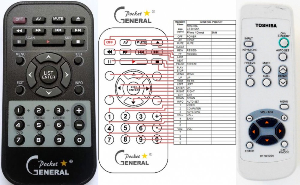 Náhradní dálkový ovladač TOSHIBA CT-90106A (CT90106A) - 100% náhrada 1:1 za originální dálkový ovladač. Dálkový ovladač byl vyvinut speciálně na míru pro tyto modely značky TOSHIBA:TLP250, TLP251, TLP261, TLP550, TLP551, TLPMT4. (Nemusí zde být uvedeny úplně všechny kompatibilní modely. Pokud si nejste jisti, sdělte nám svůj model (použijte online chat, e-mail, telefon), neprodleně zkontrolujeme a ověříme, zda je tento ovladač kompatibilní s Vaším přístrojem. Za poskytnutou informaci ručíme.) Ovladač je dodáván ve verzi značkového dálkového ovladače General POCKET (zobrazen vlevo). Garantujeme Vám, že dostanete ovladač, který plně nahradí Váš původní originální ovladač a bude mít naprosto všechny funkce stejné.Není to univerzální ovladač, ale ovladač, který je naprogramován a přímo určen pro modely přístrojů uvedené výše. Není třeba žádné párování, žádné kódy. Obdržíte od nás ovladač, který je připraven k použití - jediné, co musíte udělat, je vložit baterie a ovladač hned funguje. Podívejte se na obrázek ovladače a ujistěte se, že jsou v tabulce všechny funkce jako na původním originálním ovladači. Jedná se o plnohodnotný náhradní dálkový ovladač (není to „univerzál“). Má naprosto všechny funkce přesně jako originální ovladač. Záruční lhůta na ovladač je 3 roky. Dodáván také jednoduchý návod s mapováním funkcí.