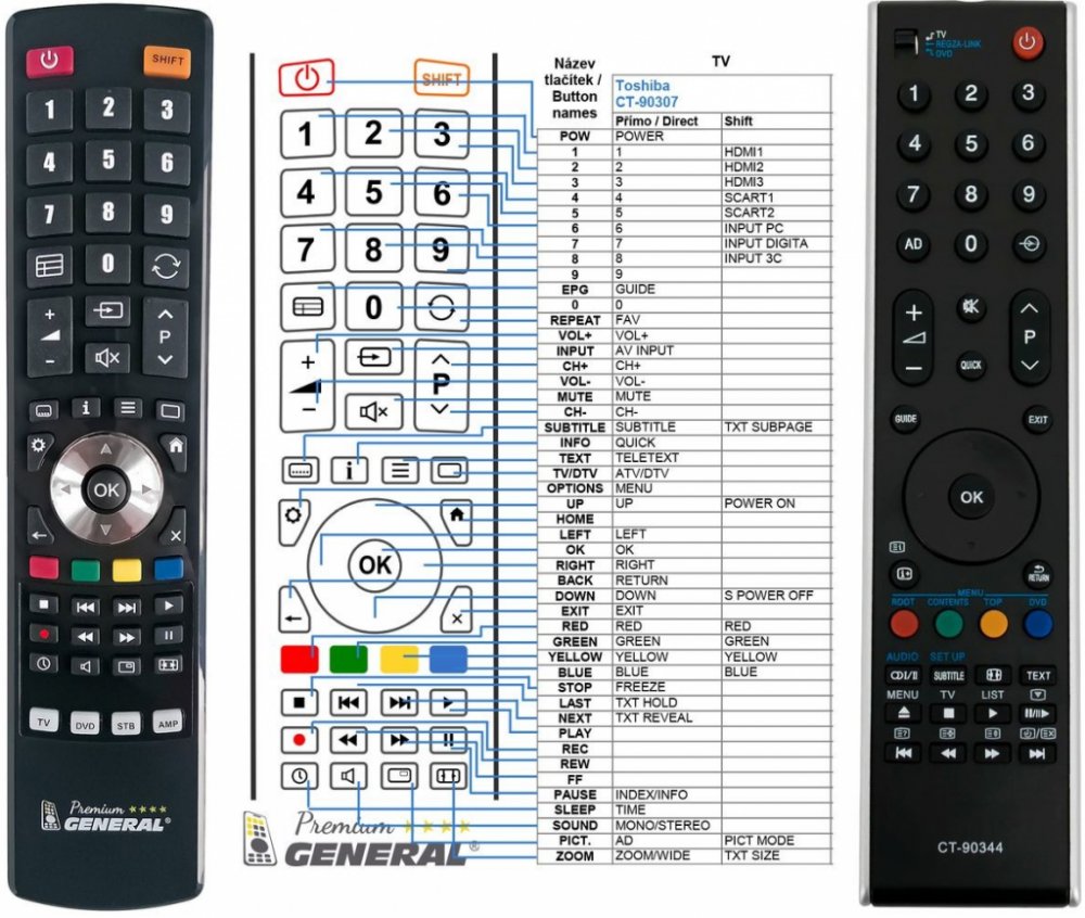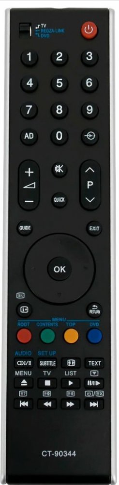 Náhradní dálkový ovladač TOSHIBA CT-90344 (CT90344) - 100% náhrada 1:1 za originální dálkový ovladač. Dálkový ovladač je určen pro tyto modely TOSHIBA:32MV732, 32RV733, 32RV743, 32RV753DB, 32TV743, 32VL743, 32XV623D, 32XV625D, 32XV626D, 32XV633D, 32XV635D, 32XV636D, 32XV733, 32XV743, 32YL743, 32ZV625D, 32ZV635D, 32ZV743, 37MV732, 37RV713B, 37RV733, 37RV743, 37RV753, 37TV743, 37XV623D, 37XV625D, 37XV626D, 37XV633D, 37XV635D, 37XV636D, 37XV733, 37XV743, 37ZV625D, 37ZV635, 37ZV635D, 37ZV743, 40MV732, 40RV733G, 40RV743, 40RV753, 40TV743, 40VL743, 40WL743, 40XV733, 40XV743, 40YL743, 40ZV743, 42RV733, 42XV623D, 42XV625D, 42XV626D, 42XV632D, 42XV633D, 42XV635D, 42XV636D, 42ZV625D, 42ZV635D, 46MV732, 46VL743, 46WL743, 46XV623D, 46XV625D, 46XV626D, 46XV633D, 46XV635D, 46XV636D, 46XV733, 46YL743, 46ZV625D, 46ZV635D, 55WL743. (Nemusí zde být uvedeny úplně všechny kompatibilní modely. Pokud si nejste jisti, sdělte nám svůj model (použijte online chat, e-mail, telefon), neprodleně zkontrolujeme a ověříme, zda je tento ovladač kompatibilní s Vaším přístrojem. Za poskytnutou informaci ručíme.) Ovladač je dodáván ve verzi značkového dálkového ovladače General Premium (zobrazen vlevo). Garantujeme Vám, že dostanete ovladač, který plně nahradí Váš původní originální ovladač a bude mít naprosto všechny funkce stejné.Není to univerzální ovladač, ale ovladač, který je naprogramován a přímo určen pro modely přístrojů uvedené výše. Není třeba žádné párování, žádné kódy. Obdržíte od nás ovladač, který je připraven k použití - jediné, co musíte udělat, je vložit baterie a ovladač hned funguje. Podívejte se na obrázek ovladače a ujistěte se, že jsou v tabulce všechny funkce jako na původním originálním ovladači. Jedná se o plnohodnotný náhradní dálkový ovladač (není to „univerzál“). Má naprosto všechny funkce přesně jako originální ovladač. Záruční lhůta na ovladač je 3 roky. Dodáván také jednoduchý návod s mapováním funkcí. DOPLŇKOVÁ FUNKCE: Tento dálkový ovladač je možno naprogramovat n..