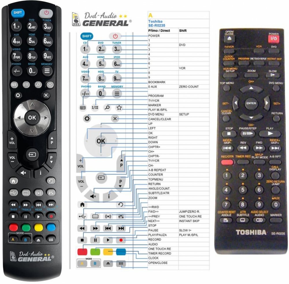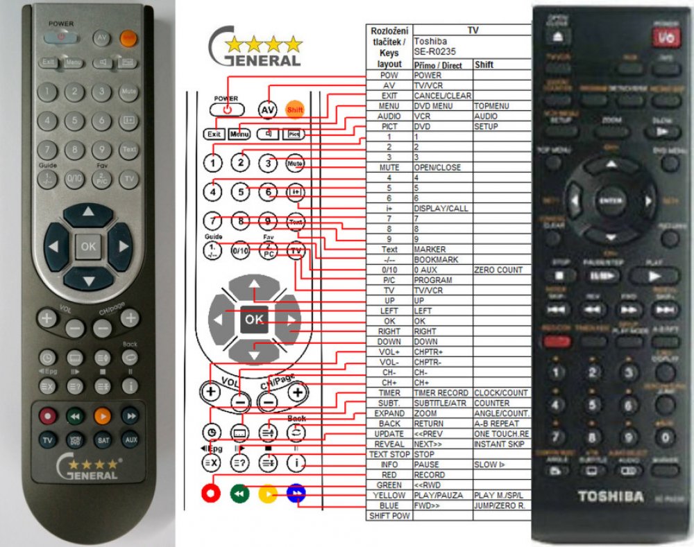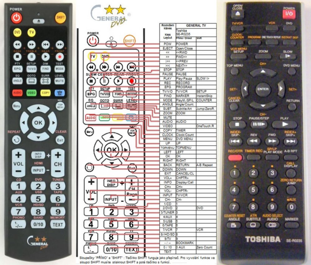 Náhradní dálkový ovladač TOSHIBA SE-R0235 (SER0235) - 100% náhrada 1:1 za originální dálkový ovladač. Dálkový ovladač byl vyvinut speciálně na míru pro tyto modely značky TOSHIBA:SD-37V, SD-37VESE, SD-38 VEKE COMBO, SD-38VE, SD-38VEKE, SD38VE. (Nemusí zde být uvedeny úplně všechny kompatibilní modely. Pokud si nejste jisti, sdělte nám svůj model (použijte online chat, e-mail, telefon), neprodleně zkontrolujeme a ověříme, zda je tento ovladač kompatibilní s Vaším přístrojem. Za poskytnutou informaci ručíme.) Ovladač je dodáván ve verzi značkového dálkového ovladače General DVD/AUDIO (zobrazen vlevo). Garantujeme Vám, že dostanete ovladač, který plně nahradí Váš původní originální ovladač a bude mít naprosto všechny funkce stejné.Není to univerzální ovladač, ale ovladač, který je naprogramován a přímo určen pro modely přístrojů uvedené výše. Není třeba žádné párování, žádné kódy. Obdržíte od nás ovladač, který je připraven k použití - jediné, co musíte udělat, je vložit baterie a ovladač hned funguje. Podívejte se na obrázek ovladače a ujistěte se, že jsou v tabulce všechny funkce jako na původním originálním ovladači. Jedná se o plnohodnotný náhradní dálkový ovladač (není to „univerzál“). Má naprosto všechny funkce přesně jako originální ovladač. Záruční lhůta na ovladač je 3 roky. Dodáván také jednoduchý návod s mapováním funkcí. DOPLŇKOVÁ FUNKCE: Tento dálkový ovladač je možno naprogramovat na 1 další přístroj. Budete moci jedním ovladačem ovládat oba přístroje (např. DVD+TV nebo SOUNDBAR+TV apod.). Pokud nám do komentáře v objednávce napíšete model dalšího přístroje, naprogramujeme Vám ovladač na oba. Za tuto doplňkovou službu bude naúčtován příplatek k ceně ovladače 50 Kč: více informací