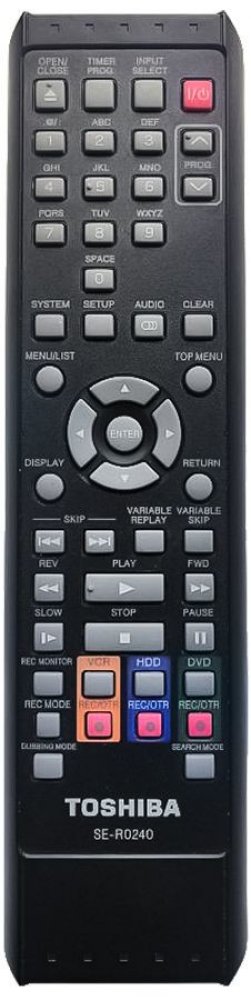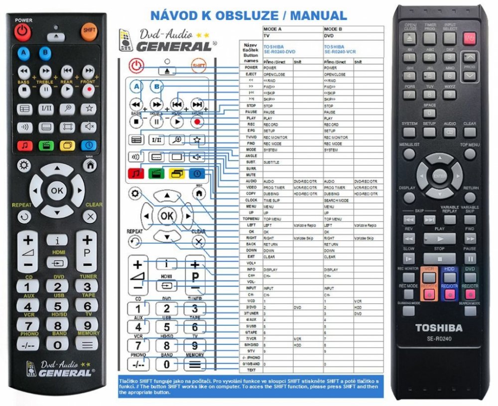 Náhradní dálkový ovladač TOSHIBA SE-R0240 (SER0240) - 100% náhrada 1:1 za originální dálkový ovladač. Dálkový ovladač byl vyvinut speciálně na míru pro tyto modely značky TOSHIBA:RDXV45KE, RDXV45KF. (Nemusí zde být uvedeny úplně všechny kompatibilní modely. Pokud si nejste jisti, sdělte nám svůj model (použijte online chat, e-mail, telefon), neprodleně zkontrolujeme a ověříme, zda je tento ovladač kompatibilní s Vaším přístrojem. Za poskytnutou informaci ručíme.) Ovladač je dodáván ve verzi značkového dálkového ovladače General DVD/AUDIO (zobrazen vlevo). Garantujeme Vám, že dostanete ovladač, který plně nahradí Váš původní originální ovladač a bude mít naprosto všechny funkce stejné.Není to univerzální ovladač, ale ovladač, který je naprogramován a přímo určen pro modely přístrojů uvedené výše. Není třeba žádné párování, žádné kódy. Obdržíte od nás ovladač, který je připraven k použití - jediné, co musíte udělat, je vložit baterie a ovladač hned funguje. Podívejte se na obrázek ovladače a ujistěte se, že jsou v tabulce všechny funkce jako na původním originálním ovladači. Jedná se o plnohodnotný náhradní dálkový ovladač (není to „univerzál“). Má naprosto všechny funkce přesně jako originální ovladač. Záruční lhůta na ovladač je 3 roky. Dodáván také jednoduchý návod s mapováním funkcí. DOPLŇKOVÁ FUNKCE: Tento dálkový ovladač je možno naprogramovat na 1 další přístroj. Budete moci jedním ovladačem ovládat oba přístroje (např. DVD+TV nebo SOUNDBAR+TV apod.). Pokud nám do komentáře v objednávce napíšete model dalšího přístroje, naprogramujeme Vám ovladač na oba. Za tuto doplňkovou službu bude naúčtován příplatek k ceně ovladače 50 Kč: více informací