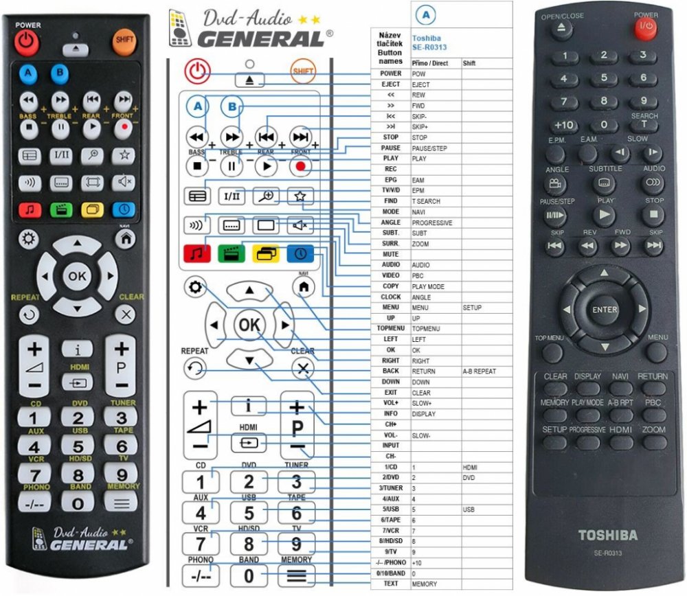 Náhradní dálkový ovladač TOSHIBA SE-R0313 (SER0313) - 100% náhrada 1:1 za originální dálkový ovladač. Dálkový ovladač byl vyvinut speciálně na míru pro tyto modely značky TOSHIBA:SD-200KU, SD-380, SD-4200, SD-6100, SD-6100KU, SD-7200, SDK-980, SDK-980K, SDK-980KU, SDK-990KU. (Nemusí zde být uvedeny úplně všechny kompatibilní modely. Pokud si nejste jisti, sdělte nám svůj model (použijte online chat, e-mail, telefon), neprodleně zkontrolujeme a ověříme, zda je tento ovladač kompatibilní s Vaším přístrojem. Za poskytnutou informaci ručíme.) Ovladač je dodáván ve verzi značkového dálkového ovladače General DVD/AUDIO (zobrazen vlevo). Garantujeme Vám, že dostanete ovladač, který plně nahradí Váš původní originální ovladač a bude mít naprosto všechny funkce stejné.Není to univerzální ovladač, ale ovladač, který je naprogramován a přímo určen pro modely přístrojů uvedené výše. Není třeba žádné párování, žádné kódy. Obdržíte od nás ovladač, který je připraven k použití - jediné, co musíte udělat, je vložit baterie a ovladač hned funguje. Podívejte se na obrázek ovladače a ujistěte se, že jsou v tabulce všechny funkce jako na původním originálním ovladači. Jedná se o plnohodnotný náhradní dálkový ovladač (není to „univerzál“). Má naprosto všechny funkce přesně jako originální ovladač. Záruční lhůta na ovladač je 3 roky. Dodáván také jednoduchý návod s mapováním funkcí. DOPLŇKOVÁ FUNKCE: Tento dálkový ovladač je možno naprogramovat na 1 další přístroj. Budete moci jedním ovladačem ovládat oba přístroje (např. DVD+TV nebo SOUNDBAR+TV apod.). Pokud nám do komentáře v objednávce napíšete model dalšího přístroje, naprogramujeme Vám ovladač na oba. Za tuto doplňkovou službu bude naúčtován příplatek k ceně ovladače 50 Kč: více informací