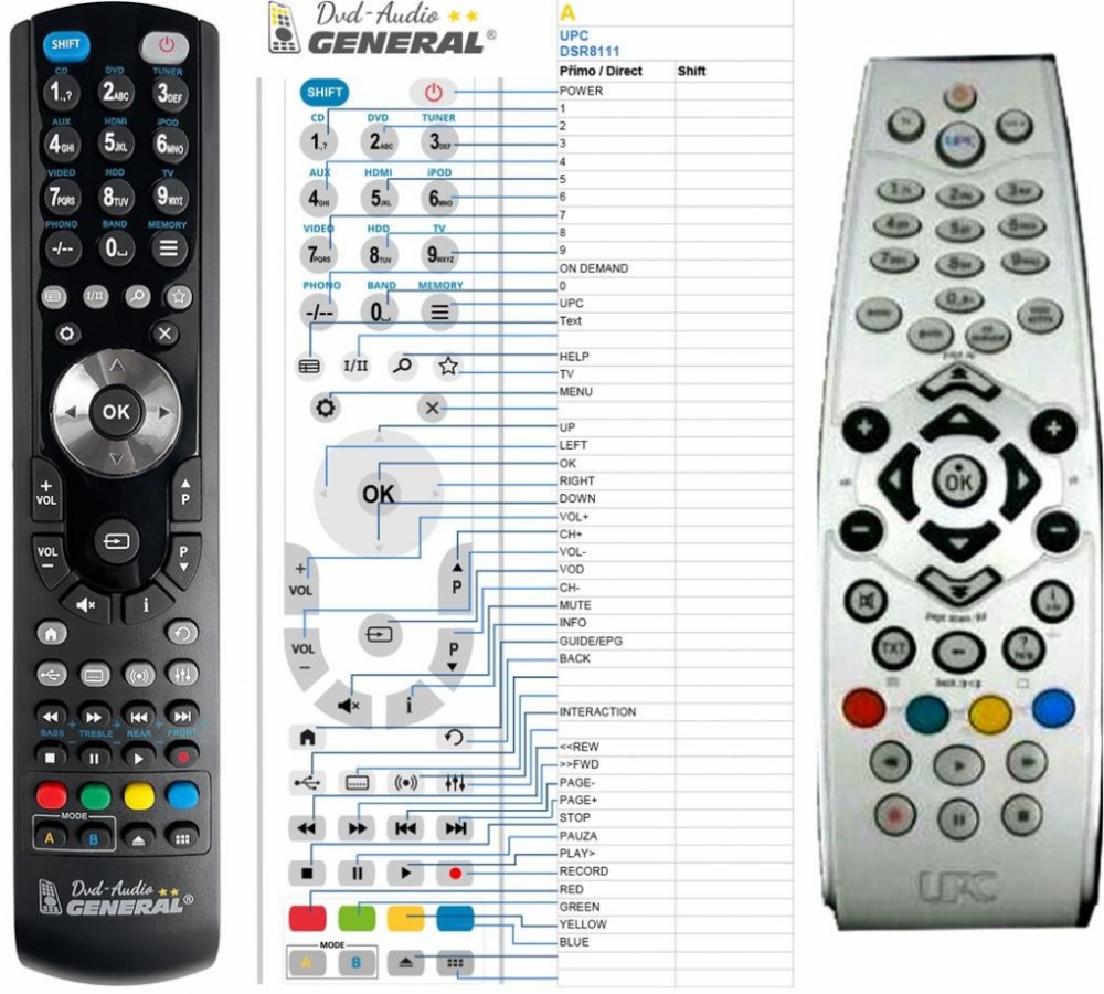 Náhradní dálkový ovladač UPC PHILIPS DSR8111/53 - 100% náhrada 1:1 za originální dálkový ovladač. Dálkový ovladač byl vyvinut speciálně na míru pro tyto modely značky UPC:DSR8111, DSR8111/53, DSR8111/53 MEDIABOX HD. (Nemusí zde být uvedeny úplně všechny kompatibilní modely. Pokud si nejste jisti, sdělte nám svůj model (použijte online chat, e-mail, telefon), neprodleně zkontrolujeme a ověříme, zda je tento ovladač kompatibilní s Vaším přístrojem. Za poskytnutou informaci ručíme.) Ovladač je dodáván ve verzi značkového dálkového ovladače General DVD/AUDIO (zobrazen vlevo). Garantujeme Vám, že dostanete ovladač, který plně nahradí Váš původní originální ovladač a bude mít naprosto všechny funkce stejné.Není to univerzální ovladač, ale ovladač, který je naprogramován a přímo určen pro modely přístrojů uvedené výše. Není třeba žádné párování, žádné kódy. Obdržíte od nás ovladač, který je připraven k použití - jediné, co musíte udělat, je vložit baterie a ovladač hned funguje. Podívejte se na obrázek ovladače a ujistěte se, že jsou v tabulce všechny funkce jako na původním originálním ovladači. Jedná se o plnohodnotný náhradní dálkový ovladač (není to „univerzál“). Má naprosto všechny funkce přesně jako originální ovladač. Záruční lhůta na ovladač je 3 roky. Dodáván také jednoduchý návod s mapováním funkcí. DOPLŇKOVÁ FUNKCE: Tento dálkový ovladač je možno naprogramovat na 1 další přístroj. Budete moci jedním ovladačem ovládat oba přístroje (např. DVD+TV nebo SOUNDBAR+TV apod.). Pokud nám do komentáře v objednávce napíšete model dalšího přístroje, naprogramujeme Vám ovladač na oba. Za tuto doplňkovou službu bude naúčtován příplatek k ceně ovladače 50 Kč: více informací