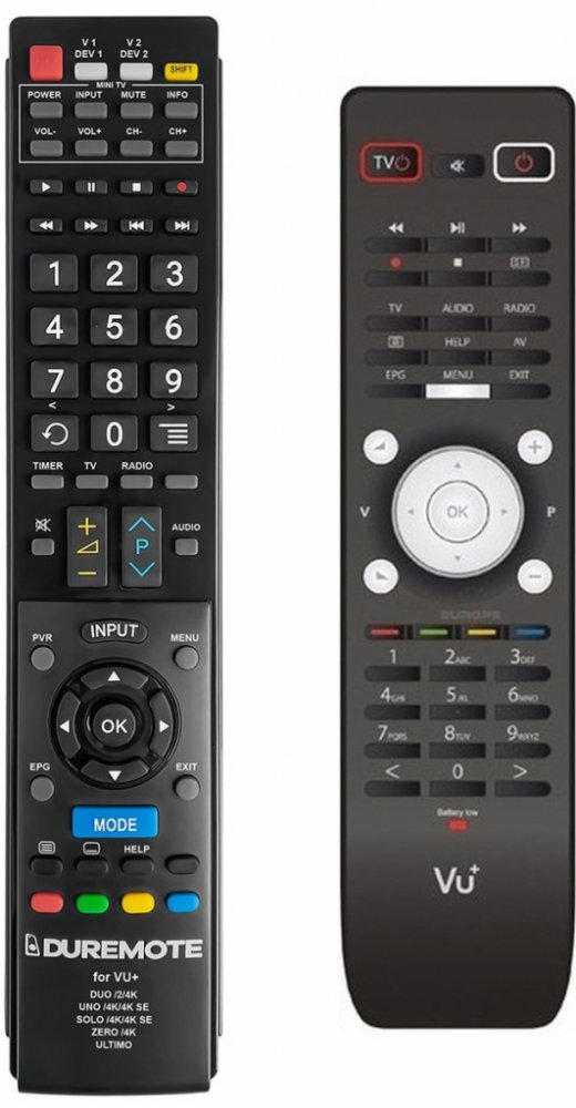 Náhradní dálkový ovladač VU+ DUO2, ZERO. Dálkový ovladač byl vyvinut speciálně na míru pro tyto modely značky VU+:DUO², ZERO. (Nemusí zde být uvedeny úplně všechny kompatibilní modely. Pokud si nejste jisti, sdělte nám svůj model (použijte online chat, e-mail, telefon), neprodleně zkontrolujeme a ověříme, zda je tento ovladač kompatibilní s Vaším přístrojem. Za poskytnutou informaci ručíme.) Jak změnit kod pro různé modely VU: Stiskněte tlačítka č. 2 a 7 dohromady. LED dioda se rozsvítí. Stiskněte tlačítko „HELP“ Stiskněte 0002 (pro modely VU +: UNO, SOLO2, ULTIMO, SOLO, DUO, DUO2, SOLO SE, ZERO) nebo 0001 (pro zařízení VU + Solo / Duo)Jedná se o naprosto stejný dálkový ovladač jako originál. Jediný rozdíl je, že nemá logo VU+ (to je jediný důvod, proč je levnější). Vysoká kvalita materiálu a zpracování, naprosto bezporuchový. Všechny naše dálkové ovladače kontrolujeme a testujeme, proto garantujeme jejich spolehlivost, nadstandartně dlouhý dosah signálu a výbornou citlivost tlačítek.Tento dálkový ovladač nemusíte nijak párovat, nevyžaduje žádné nastavování ani kódy. Stačí vložit baterie a funguje se všemi výše uvedenými modely.
