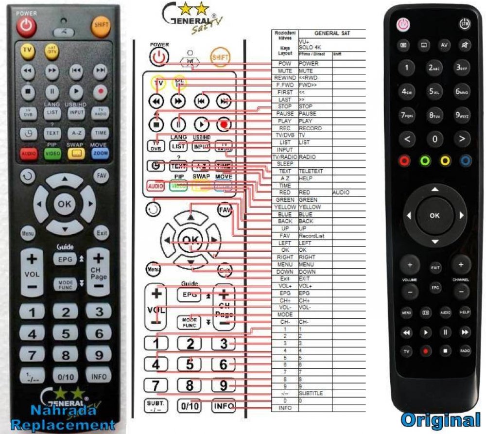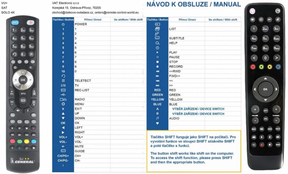 Náhradní dálkový ovladač VU+ SOLO 4K - 100% náhrada 1:1 za originální dálkový ovladač. Dálkový ovladač je určen pro tyto modely VU+:SOLO 4K, SOLO-4K, SOLO4K. (Nemusí zde být uvedeny úplně všechny kompatibilní modely. Pokud si nejste jisti, sdělte nám svůj model (použijte online chat, e-mail, telefon), neprodleně zkontrolujeme a ověříme, zda je tento ovladač kompatibilní s Vaším přístrojem. Za poskytnutou informaci ručíme.) Ovladač je dodáván ve verzi značkového dálkového ovladače General SAT/TV (zobrazen vlevo). Garantujeme Vám, že dostanete ovladač, který plně nahradí Váš původní originální ovladač a bude mít naprosto všechny funkce stejné.Není to univerzální ovladač, ale ovladač, který je naprogramován a přímo určen pro modely přístrojů uvedené výše. Není třeba žádné párování, žádné kódy. Obdržíte od nás ovladač, který je připraven k použití - jediné, co musíte udělat, je vložit baterie a ovladač hned funguje. Podívejte se na obrázek ovladače a ujistěte se, že jsou v tabulce všechny funkce jako na původním originálním ovladači. Jedná se o plnohodnotný náhradní dálkový ovladač (není to „univerzál“). Má naprosto všechny funkce přesně jako originální ovladač. Záruční lhůta na ovladač je 3 roky. Dodáván také jednoduchý návod s mapováním funkcí. DOPLŇKOVÁ FUNKCE: Tento dálkový ovladač je možno naprogramovat na 1 další přístroj. Budete moci jedním ovladačem ovládat oba přístroje (např. SAT+TV nebo SAT+DVD apod). Pokud nám do komentáře v objednávce napíšete model dalšího přístroje, naprogramujeme Vám ovladač na oba. Za tuto doplňkovou službu bude naúčtován příplatek k ceně ovladače 50 Kč: více informací