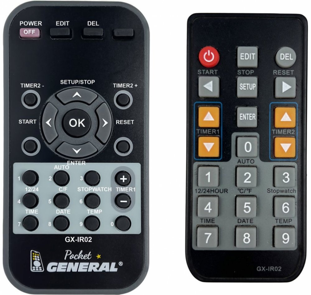 Dálkový ovladač Wall Timer GX-IR02, GanXin GX-IR0 (GXIR02, GanXin GXIR0) duplikát 1:1 originálního dálkového ovladače. Dálkový ovladač General POCKET duplikát má naprosto všechny funkce a popisky tlačítek stejné jako originální dálkový ovladač. Není třeba nic nastavovat, žádné kódy, funguje ihned po vložení baterií se všemi výše uvedenými modely.Ovladač je dodáván ve verzi značkového dálkového ovl