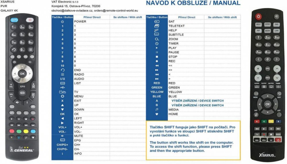 Náhradní dálkový ovladač XSARIUS Galaxy 4K - 100% náhrada 1:1 za originální dálkový ovladač. Dokonalá 1:1 kopie navržená a vyrobená naší firmou – má všechny funkce originálního ovladače pro tyto modely značky XSARIUS:GALAXY 4K. (Nemusí zde být uvedeny úplně všechny kompatibilní modely. Pokud si nejste jisti, sdělte nám svůj model (použijte online chat, e-mail, telefon), neprodleně zkontrolujeme a ověříme, zda je tento ovladač kompatibilní s Vaším přístrojem. Za poskytnutou informaci ručíme.) Ovladač je dodáván ve verzi značkového dálkového ovladače General SAT/TV (zobrazen vlevo). Garantujeme Vám, že dostanete ovladač, který plně nahradí Váš původní originální ovladač a bude mít naprosto všechny funkce stejné.Není to univerzální ovladač, ale ovladač, který je naprogramován a přímo určen pro modely přístrojů uvedené výše. Není třeba žádné párování, žádné kódy. Obdržíte od nás ovladač, který je připraven k použití - jediné, co musíte udělat, je vložit baterie a ovladač hned funguje. Podívejte se na obrázek ovladače a ujistěte se, že jsou v tabulce všechny funkce jako na původním originálním ovladači. Jedná se o plnohodnotný náhradní dálkový ovladač (není to „univerzál“). Má naprosto všechny funkce přesně jako originální ovladač. Záruční lhůta na ovladač je 3 roky. Dodáván také jednoduchý návod s mapováním funkcí. DOPLŇKOVÁ FUNKCE: Tento dálkový ovladač je možno naprogramovat na 1 další přístroj. Budete moci jedním ovladačem ovládat oba přístroje (např. SAT+TV nebo SAT+DVD apod). Pokud nám do komentáře v objednávce napíšete model dalšího přístroje, naprogramujeme Vám ovladač na oba. Za tuto doplňkovou službu bude naúčtován příplatek k ceně ovladače 50 Kč: více informací