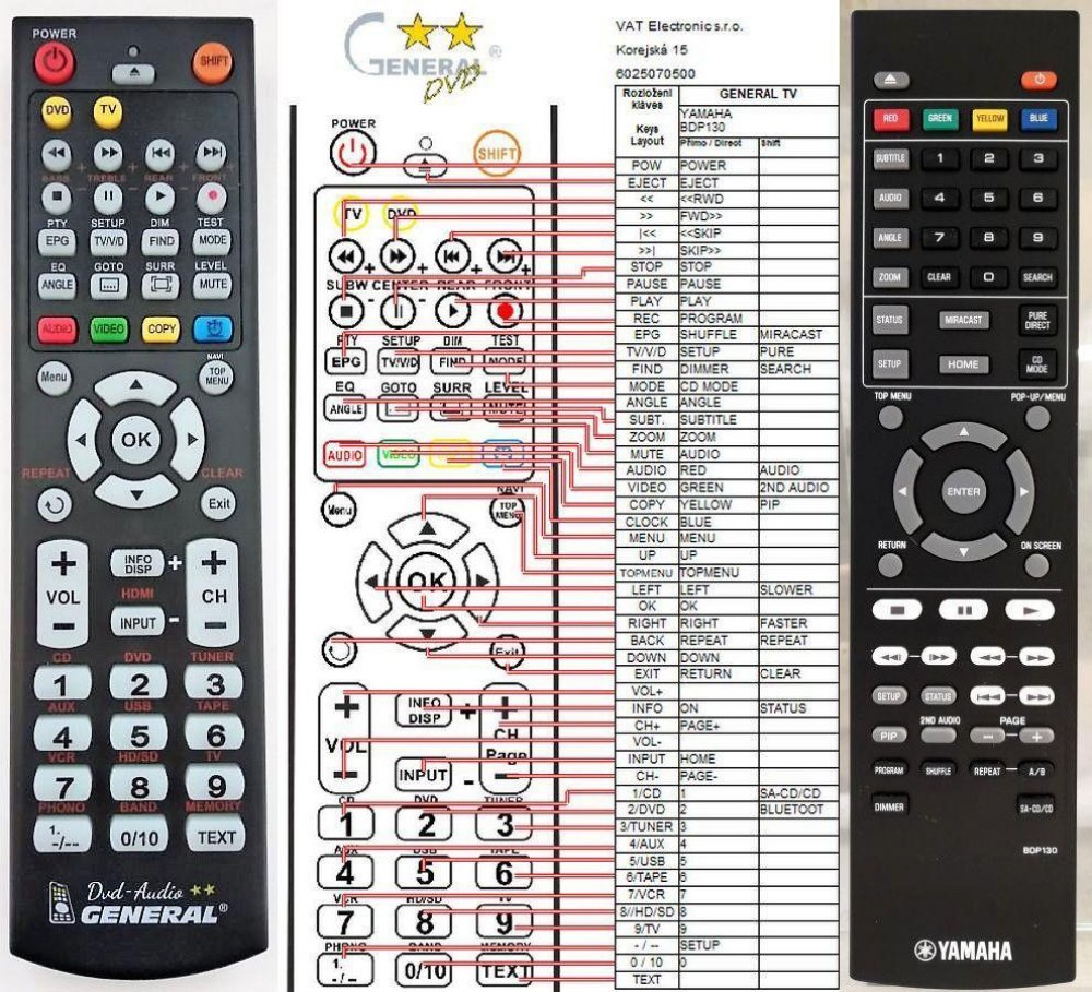 Náhradní dálkový ovladač YAMAHA BDP130 - 100procent náhrada 1:1 za originální dálkový ovladač. Dálkový ovladač je určen pro tyto modely YAMAHA: BD-A1060, BD-S681, BDA1060, BDS681. (Nemusí zde být uvedeny úplně všechny kompatibilní modely. Pokud si nejste jisti, sdělte nám svůj model (použijte online chat, e-mail, telefon), neprodleně zkontrolujeme a ověříme, zda je tento ovladač kompatibilní s Vaším přístrojem. Za poskytnutou informaci ručíme.) Ovladač je dodáván ve verzi značkového dálkového ovladače General DVD/AUDIO (zobrazen vlevo). Garantujeme Vám, že dostanete ovladač, který plně nahradí Váš původní originální ovladač a bude mít naprosto všechny funkce. Není to univerzální ovladač, ale ovladač, který je naprogramován a přímo určen pro modely přístrojů uvedené výše. Není třeba žádné párování, žádné kódy. Obdržíte od nás ovladač, který je připraven k použití - jediné, co musíte udělat, je vložit baterie a ovladač hned funguje. Podívejte se na obrázek ovladače a ujistěte se, že jsou v tabulce všechny funkce jako na původním originálním ovladači. Jedná se o plnohodnotný náhradní dálkový ovladač (není to „univerzál“). Má naprosto všechny funkce přesně jako originální ovladač. Záruční lhůta na ovladač je 2 roky. Dodáván také jednoduchý návod s mapováním funkcí. DOPLŇKOVÁ FUNKCE: Tento dálkový ovladač je možno naprogramovat na 1 další přístroj. Budete moci jedním ovladačem ovládat oba přístroje (např. DVD plus TV nebo SOUNDBAR plus TV apod.). Pokud nám do komentáře v objednávce napíšete model dalšího přístroje, naprogramujeme Vám ovladač na oba. Za tuto doplňkovou službu bude naúčtován příplatek k ceně ovladače 50 Kč: více informací
