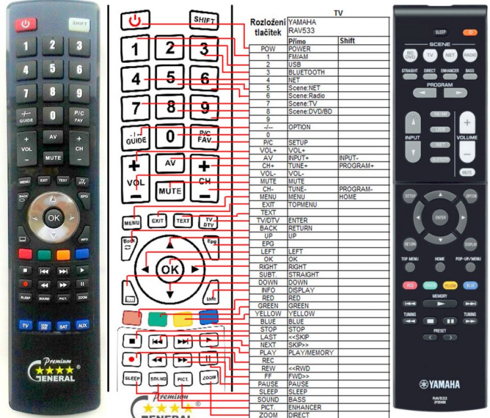 Náhradní dálkový ovladač YAMAHA RAV533. Dálkový ovladač byl vyvinut speciálně na míru pro tyto modely značky YAMAHA:HTR-4068, HTR4068, RX-V479, RXV479. (Nemusí zde být uvedeny úplně všechny kompatibilní modely. Pokud si nejste jisti, sdělte nám svůj model (použijte online chat, e-mail, telefon), neprodleně zkontrolujeme a ověříme, zda je tento ovladač kompatibilní s Vaším přístrojem. Za poskytnuto...
