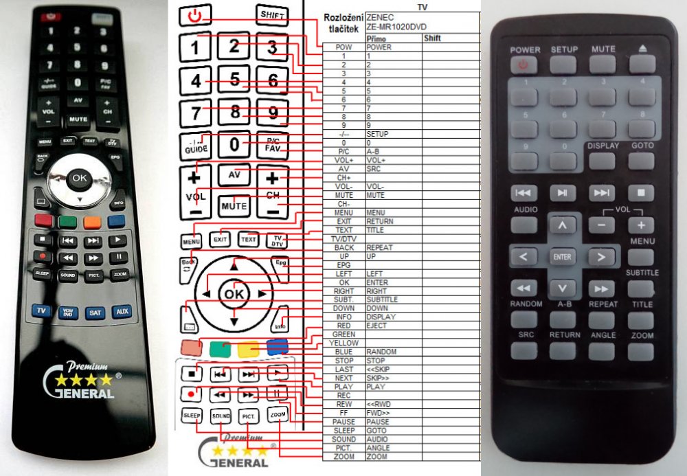 Náhradní dálkový ovladač ZENEC ZE-MR1020DVD (ZEMR1020DVD) - 100% náhrada 1:1 za originální dálkový ovladač. Dálkový ovladač byl vyvinut speciálně na míru pro tyto modely značky ZENEC:ZE-MR1020DVD, ZEMR1020DVD . (Nemusí zde být uvedeny úplně všechny kompatibilní modely. Pokud si nejste jisti, sdělte nám svůj model (použijte online chat, e-mail, telefon), neprodleně zkontrolujeme a ověříme, zda je tento ovladač kompatibilní s Vaším přístrojem. Za poskytnutou informaci ručíme.) Ovladač je dodáván ve verzi značkového dálkového ovladače General Premium (zobrazen vlevo). Garantujeme Vám, že dostanete ovladač, který plně nahradí Váš původní originální ovladač a bude mít naprosto všechny funkce stejné.Není to univerzální ovladač, ale ovladač, který je naprogramován a přímo určen pro modely přístrojů uvedené výše. Není třeba žádné párování, žádné kódy. Obdržíte od nás ovladač, který je připraven k použití - jediné, co musíte udělat, je vložit baterie a ovladač hned funguje. Podívejte se na obrázek ovladače a ujistěte se, že jsou v tabulce všechny funkce jako na původním originálním ovladači. Jedná se o plnohodnotný náhradní dálkový ovladač (není to „univerzál“). Má naprosto všechny funkce přesně jako originální ovladač. Záruční lhůta na ovladač je 3 roky. Dodáván také jednoduchý návod s mapováním funkcí. DOPLŇKOVÁ FUNKCE: Tento dálkový ovladač je možno naprogramovat na 1-4 zařízení (celkem tedy 4). Budete moci jedním ovladačem ovládat několik různých přístrojů jedním ovladačem. Pokud nám do komentáře v objednávce napíšete modely dalších přístrojů, naprogramujeme Vám ovladač na všechny. Za tuto doplňkovou službu bude naúčtován příplatek k ceně ovladače 50 Kč: více informacíV případě, že v budoucnu vyměníte/obměníte Vaši domácí elektroniku, jsme schopni Vám tento ovladač přeprogramovat na naprosto jakékoliv nové/á zařízení. Ovladač General přežije Váš stávající přístroj!