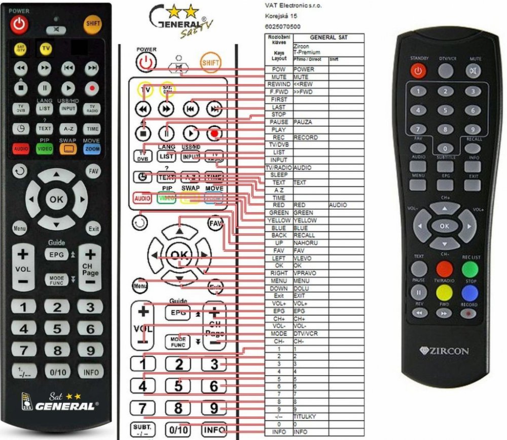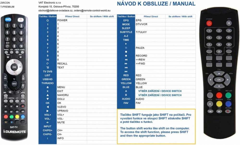 Náhradní dálkový ovladač ZIRCON T-PREMIUM (TPREMIUM) - 100% náhrada 1:1 za originální dálkový ovladač. Dálkový ovladač byl vyvinut speciálně na míru pro tyto modely značky ZIRCON:T-ECO, T-PREMIUM. (Nemusí zde být uvedeny úplně všechny kompatibilní modely. Pokud si nejste jisti, sdělte nám svůj model (použijte online chat, e-mail, telefon), neprodleně zkontrolujeme a ověříme, zda je tento ovladač kompatibilní s Vaším přístrojem. Za poskytnutou informaci ručíme.) Ovladač je dodáván ve verzi značkového dálkového ovladače General Duremote (zobrazen vlevo). Garantujeme Vám, že dostanete ovladač, který plně nahradí Váš původní originální ovladač a bude mít naprosto všechny funkce stejné.Není to univerzální ovladač, ale ovladač, který je naprogramován a přímo určen pro modely přístrojů uvedené výše. Není třeba žádné párování, žádné kódy. Obdržíte od nás ovladač, který je připraven k použití - jediné, co musíte udělat, je vložit baterie a ovladač hned funguje. Podívejte se na obrázek ovladače a ujistěte se, že jsou v tabulce všechny funkce jako na původním originálním ovladači. Jedná se o plnohodnotný náhradní dálkový ovladač (není to „univerzál“). Má naprosto všechny funkce přesně jako originální ovladač. Záruční lhůta na ovladač je 3 roky. Dodáván také jednoduchý návod s mapováním funkcí. DOPLŇKOVÁ FUNKCE: Tento dálkový ovladač je možno naprogramovat na 1 další přístroj. Budete moci jedním ovladačem ovládat oba přístroje. Pokud nám do komentáře v objednávce napíšete model dalšího přístroje, naprogramujeme Vám ovladač na oba. Za tuto doplňkovou službu bude naúčtován příplatek k ceně ovladače 50 Kč: více informací