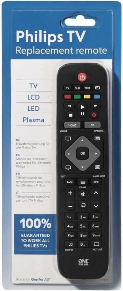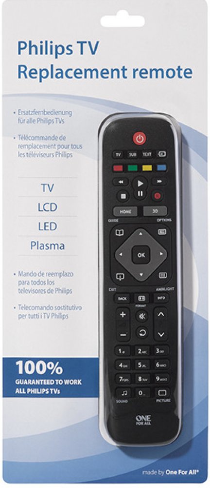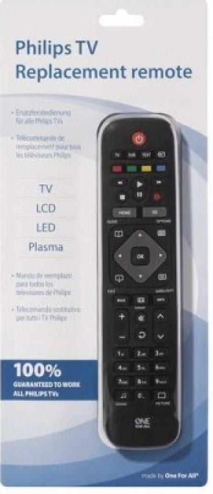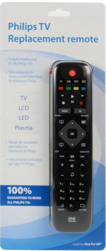 Univerzální dálkový ovladač pro TV Phillips. Výrobce garantuje 100% kompatibilitu se všemi Phillips televizemi. Univerzální dálkový ovladač pro TV Phillips. Výrobce garantuje 100% kompatibilitu se všemi Phillips televizemi. Pro zprovoznění není vyžadováno žádné složité nastavení. Ovladač zároveň podporuje všechna specifická tlačítka jako Browse Menu, Home a Ambilight. Jeho dosah je přibližně 15 metrů, napájí ho dvě AAA baterie, jež nejsou součástí balení. Rozměry ovladače jsou 21,8 × 5,2 × 2,2 cm, hmotnost 90 g.