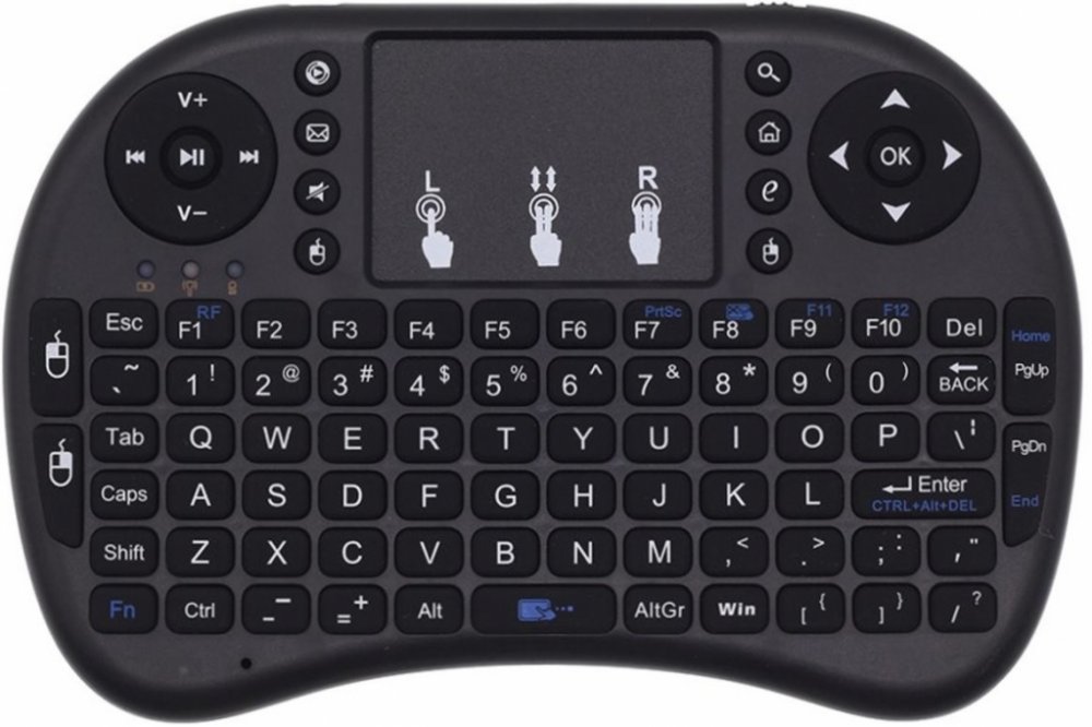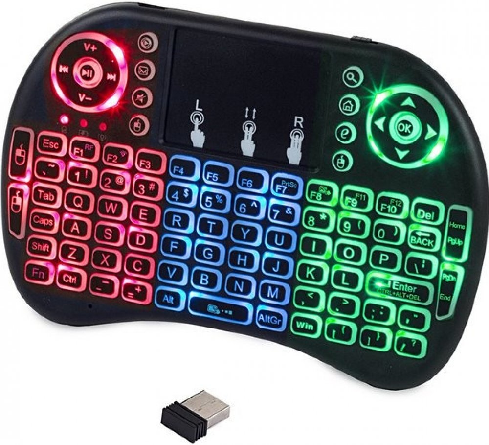 Bezdrátová Mini Klávesnice s touchpadem podporuje: Android TV Box, Google TV Box, Smart TV, PS, XBOX\nČerná barva\nBarva podsvícení: červená, zelená, modrá\nNapájení: BL-5C 1080mAh 3,7V baterie (nabíj