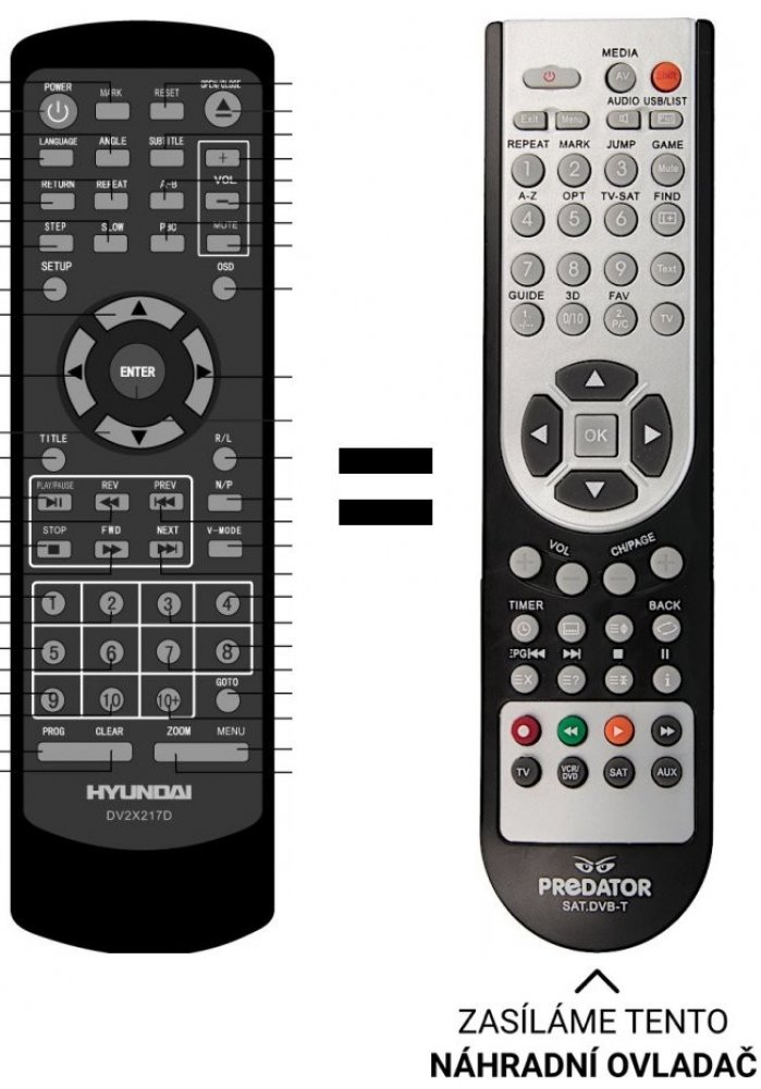 Náhradní dálkový ovladač pro DVD Hyundai DV2X279DU, DV2-X-227DU, DV2X227DU.DV2H369DU, DV2X227DU Má všechny funkce jako originál. Rozpis tlačítek je přiložen.