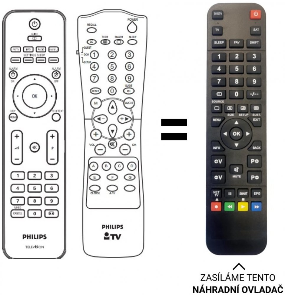 Náhradní dálkový ovladač jiného vzhledu BEZ NUTNOSTI ZADÁVAT KÓDY například pro 42HFL5850D/10, 20HF5473/10, 23HF5474/10. 32hf7875/10 Náhradní ovladač obsahuje kód jak pro hotel tak pro servis.