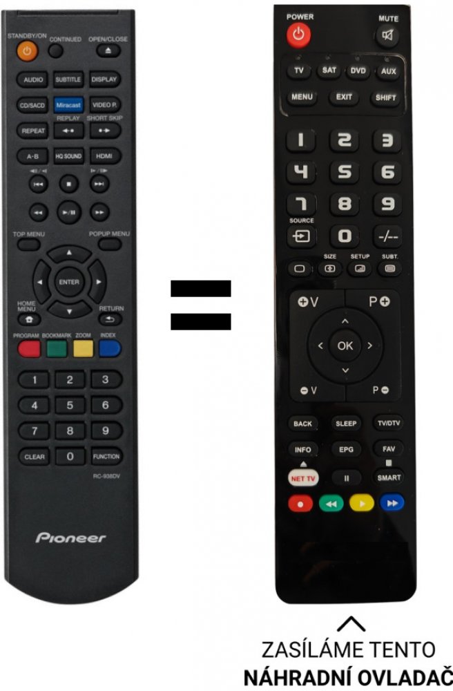 PIONEER náhradní dálkový ovladač NEPOTŘEBUJE KÓDY. RC938DV, BDPX300B, BDPX300S