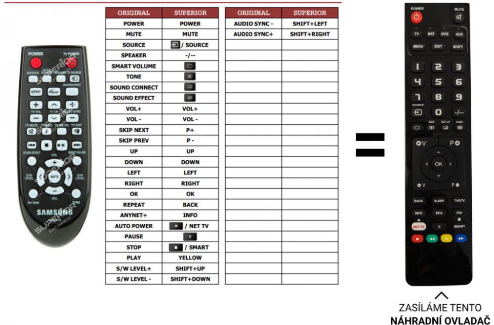Náhradní dálkový ovladač jiného vzhledu BEZ NUTNOSTI ZADÁVAT KÓDY pro domácí kina samsung HW-F450, HW-FM45, HW-FM45C, nahrazuje také AH59-02612B pro HW-H550, HW-H551