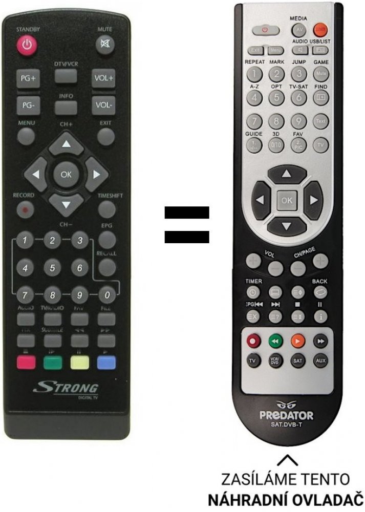 Náhradní dálkový ovladač pro DVBT Strong. Ovladač jiného vzhledu než originál. Má všechny funkce včetně nahrávání. Také pro SRT5301