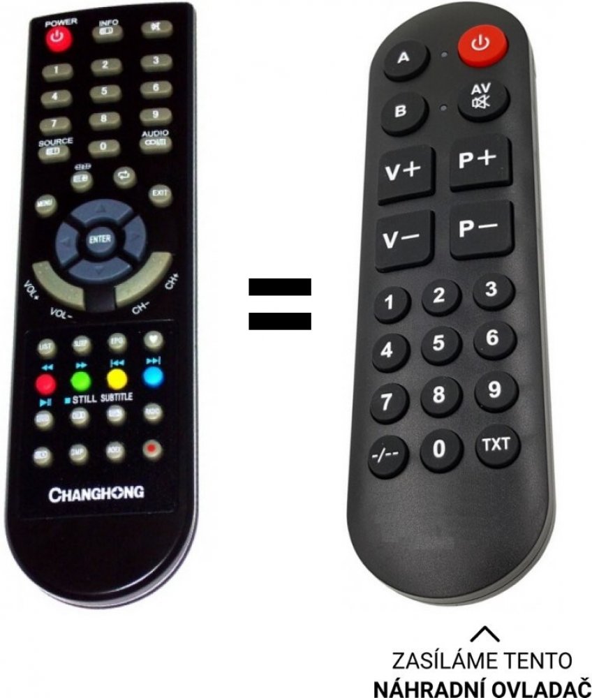 POUZE ZÁKLADNÍ FUNKCE. Changhong náhradní dálkový ovladač BEZ ZADÁVÁNÍ KÓDŮ. Pouze pro modely, které měli na originálním ovladači tlačítko pro nahrávání. Ovladač je připraven k použití, není ho potřeba nijak nastavovat.
