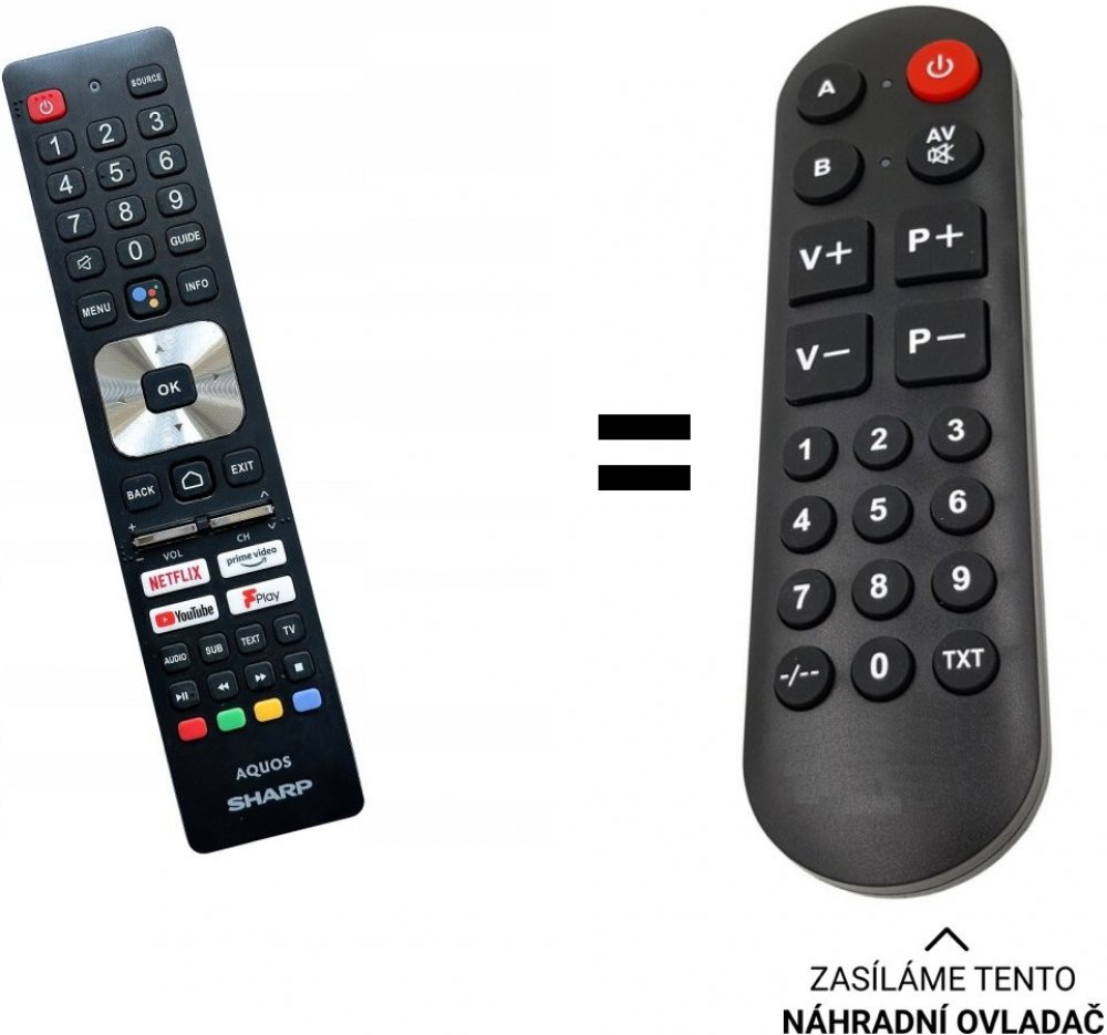 POUZE ZÁKLADNÍ FUNKCE. náhradní dálkový ovladač pro seniory pro sharp. BEZ HLASOVÉHO OVLÁDÁNÍ. Například pro 40FI6EA, 50FP5EA, 65EQ4EA, 65EQ6EA, 65EQ7EA, 65FN2EA, 70DN5EA, 70DN5KA, 70FL2EA, 75EQ4EA, 75EQ6EA, 75EQ7EA, 43GL4760E 50"~75" EQ* 70DN 43" ~65"FN*