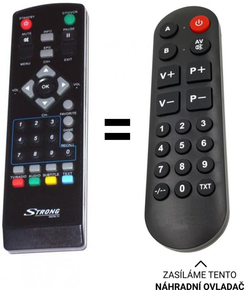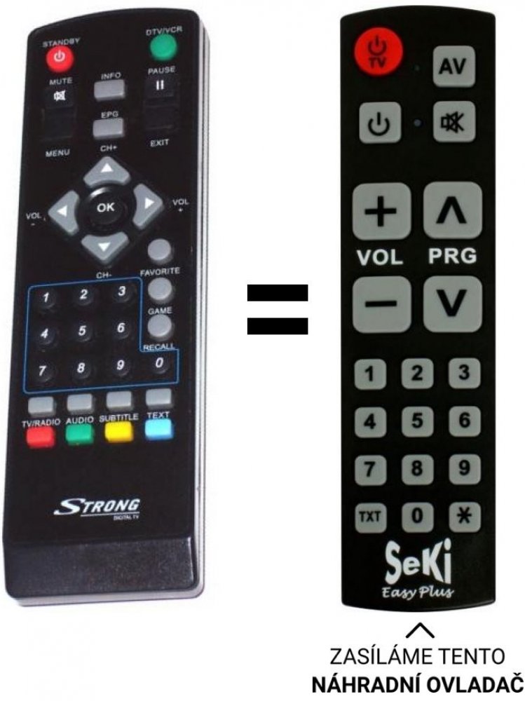 Náhradní dálkový ovladač Strong. POUZE ZÁKLADNÍ FUNKCE . Pro Strong DVBT Prima, Prima 2, Prima 3 K tomuto ovladači 3 další zdarma! Napište nám do poznámky 3 modely zařízení nebo dálkových ovladačů. Pokud je máme nahrajeme vám je do tohoto ovladače.