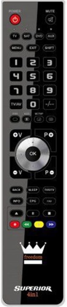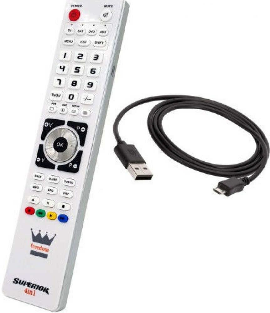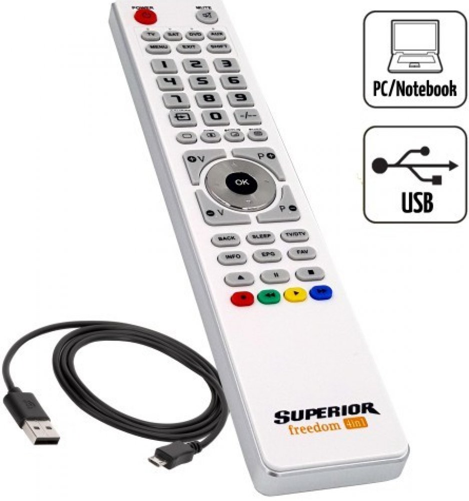 Univerzální dálkový ovladač FREEDOM 4v1 USB plně nahradí původní ovladače k audio a video přístrojům a umožní ovládat až 4 zařízení. Není nutné mít tedy na stole čtyři různé dálkové ovladače, stačí pouze jeden. Ovladač FREEDOM 4v1 USB dokáže ovládat TV, DVD, SAT a AUX, kde na volbu AUX můžete nastavit například domácí kino.