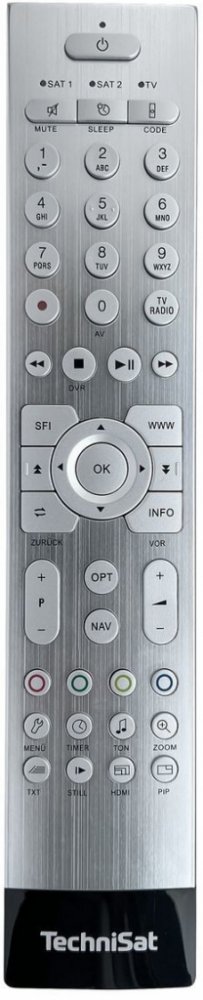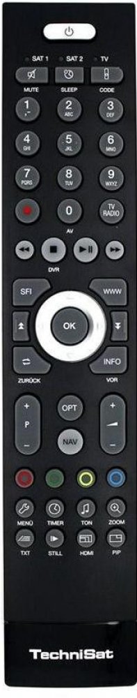 Značkový originální dálkový ovladač TECHNISAT TechniControl PVR235S UNIVERSAL. Dálkový ovladač byl vyvinut speciálně na míru pro tyto modely značky TECHNISAT: DIGIPAL 2, DIGIPAL 2 TX, DIGITSIM S2 , 000X/4721, 000X/4756, AIRSTAR TELESTICK T1, DIGI-S2, DIGICORDER HD K2X, DIGICORDER HD S2, DIGICORDER HD S2X , DIGICORDER HD S2X PLUS, DIGICORDER HDS2, DIGICORDER T1 PVR, DIGIMOD T1, DIGIPAL DAB+, DIGIPLUS STR1, DIGIPLUS STR1 X, DIGIT CCI, DIGIT HD8-S, DIGIT MF4-K, DIGIT MF4-S T1, DIGIT MF4-T, DIGIT S2, DIGITSIM S2 DIGIT CCI2, DVR401, DVR403, FBPVR135S, FBTV401B, HD8-SX, HD8S, HDK2X, HDS2X, MF4-S, MF4-S CC, SAT 2 DIGIPAL 2 TX, TECHNISAT DIGIPLUS STR 1, TECHNISAT DIGIPLUS UHD S, TECHNISAT DIGIT S3, TECHNISAT FORCE - TEVEMASTER T1, TECHNISAT SAT1, TECHNISAT TECHNISTAR K1, TECHNISAT TECHNISTAR S5, TECHNISTAR S1, TECHNISTAR S2 , TECHNISTAR SIR, TECHNISTAR SIR. DIGIT MF4-S T1, TV MASTER T1, XX/4725, XX/4726, XX/4738, XX/4752, XX/4753. (Nemusí zde být uvedeny úplně všechny kompatibilní modely. Pokud si nejste jisti, sdělte nám svůj model (použijte online chat, e-mail, telefon), neprodleně zkontrolujeme a ověříme, zda je tento ovladač kompatibilní s Vaším přístrojem. Za poskytnutou informaci ručíme.) Pozor: Dálkový ovladač není kompatibilní s přístrojem TECHNISAT TECHNIBOX SIR HD, TECHNISAT TECHNIBOX IR!Ovládá SAT i DVB-T přijímače (přepínání SAT1 a SAT2).Jedná se o ORIGINÁLNÍ dálkové ovladání, proto nevyžaduje žádné párování, nastavování ani žádné kódy. Stačí vložit baterie a funguje se všemi výše uvedenými modely.
