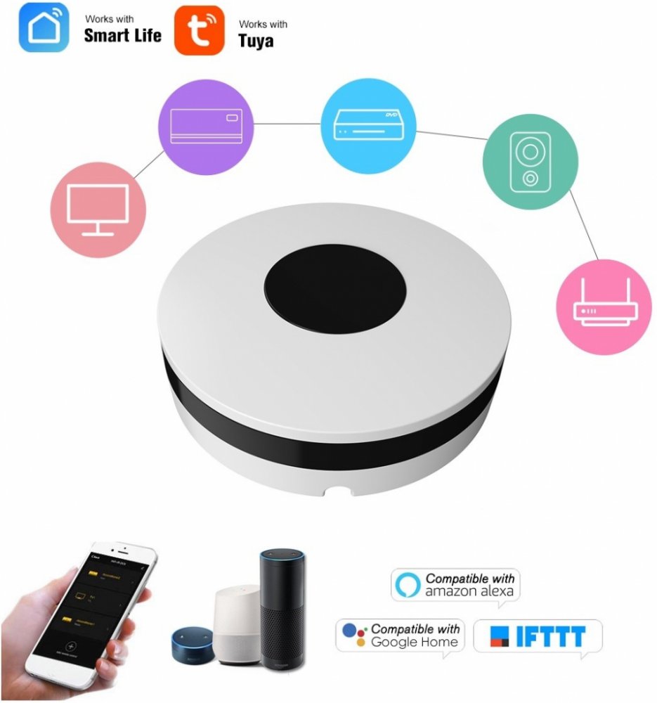 WiFi Smart IR dálkový ovladač AS-IR02 je univerzální a snadno použitelné zařízení, které umožňuje odkudkoliv sledovat a ovládat vaše domácí spotřebiče, které podporují infračervený signál, jako jsou televize, TV box, DVD přehrávače, klimatizace, ventilátor, a jiné spotřebiče ovládané pomocí chytré mobilní aplikace Tuya Smart nebo Smart Life-Smart Living s podporou v českém jazyce. Pomocí chytré aplikace si můžete nastavit inteligentní načasování, aby se domácí spotřebiče v určitém čase zapnuly nebo vypnuly. Také si můžete přizpůsobit svou domácnost a užívat komfort pomocí hlasového ovládání Amazon Alexa, Google Home. WiFi Smart IR dálkový ovladač je napájen pomocí adaptéru 230V AC/ 5V DC (USB kabel součástí balení).