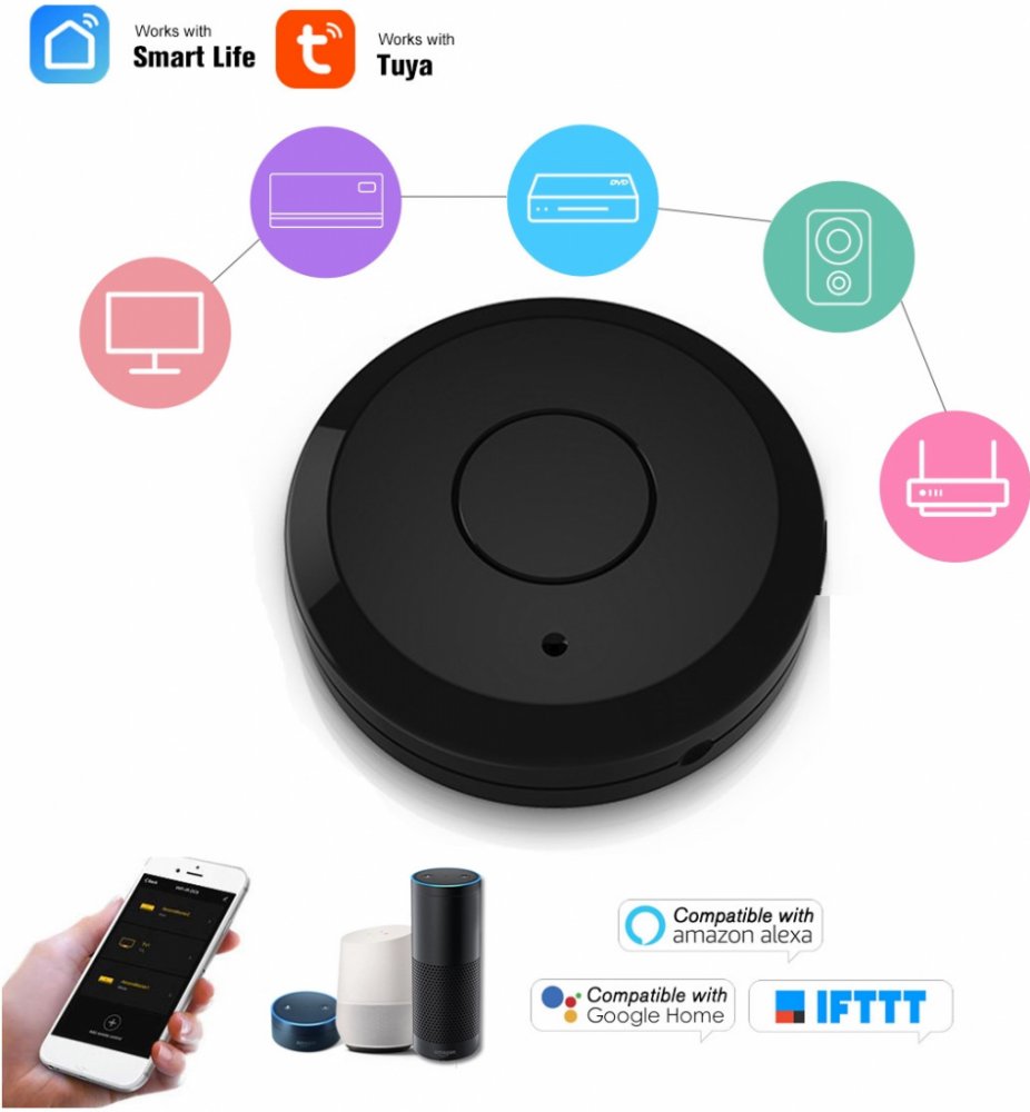 WiFi Smart IR dálkový ovladač AS-IR03W je univerzální a snadno použitelné zařízení, které umožňuje odkudkoliv sledovat a ovládat vaše domácí spotřebiče, které podporují infračervený signál, jako jsou televize, TV box, DVD přehrávače, klimatizace, ventilátor, a jiné spotřebiče ovládané pomocí chytré mobilní aplikace Tuya Smart nebo Smart Life-Smart Living s podporou v českém jazyce. Pomocí chytré aplikace si můžete nastavit inteligentní načasování, aby se domácí spotřebiče v určitém čase zapnuly nebo vypnuly. Také si můžete přizpůsobit svou domácnost a užívat komfort pomocí hlasového ovládání Amazon Alexa, Google Home. WiFi Smart IR dálkový ovladač je napájen pomocí adaptéru 230V AC/ 5V DC (USB kabel součástí balení).