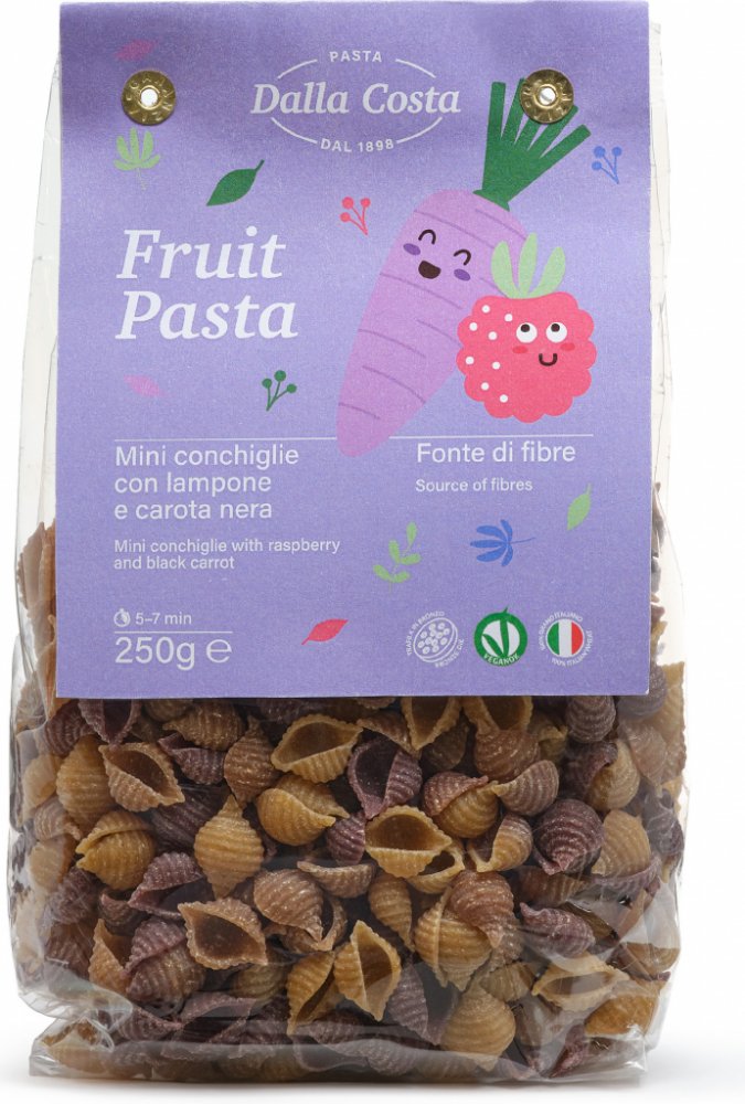Mini Conchiglie maliny&černá mrkev barevné mini mušličky DALLA COSTA 250g Barevné celozrnné semolinové těstoviny ve tvaru drobných mušliček ochucené malinami a černou mrkví určené speciálně pro nejmenší. Ovocné těstoviny Mini Conchiglie jsou plné chuti a svěžesti a byly vyvinuty tak, aby splňovaly specifické nutriční potřeby dětí. CELOZRNNÉ SEMOLINOVÉ TĚSTOVINY SUŠENÉ OCHUCENÉ MALINAMI A ČERNOU MR...