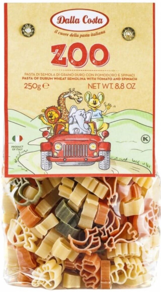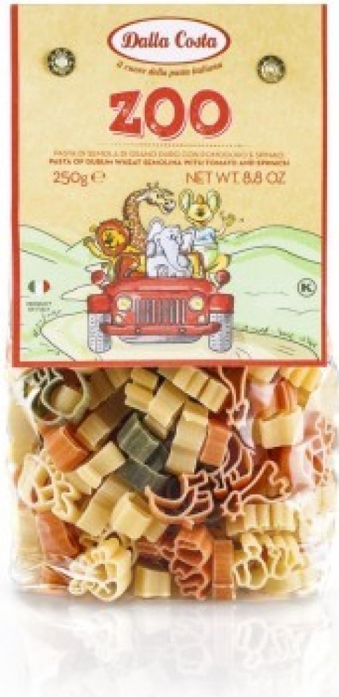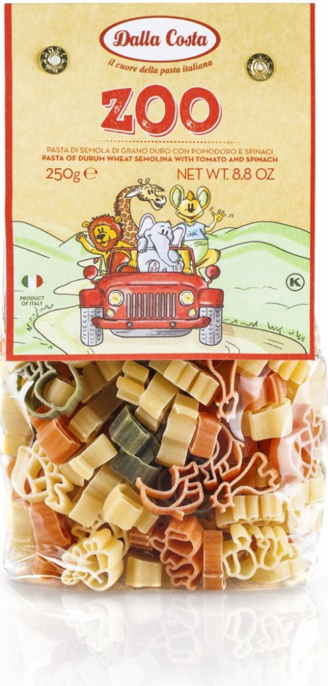 Tříbarevné dětské semolinové těstovinyve tvaru zvířátek ze ZOO.