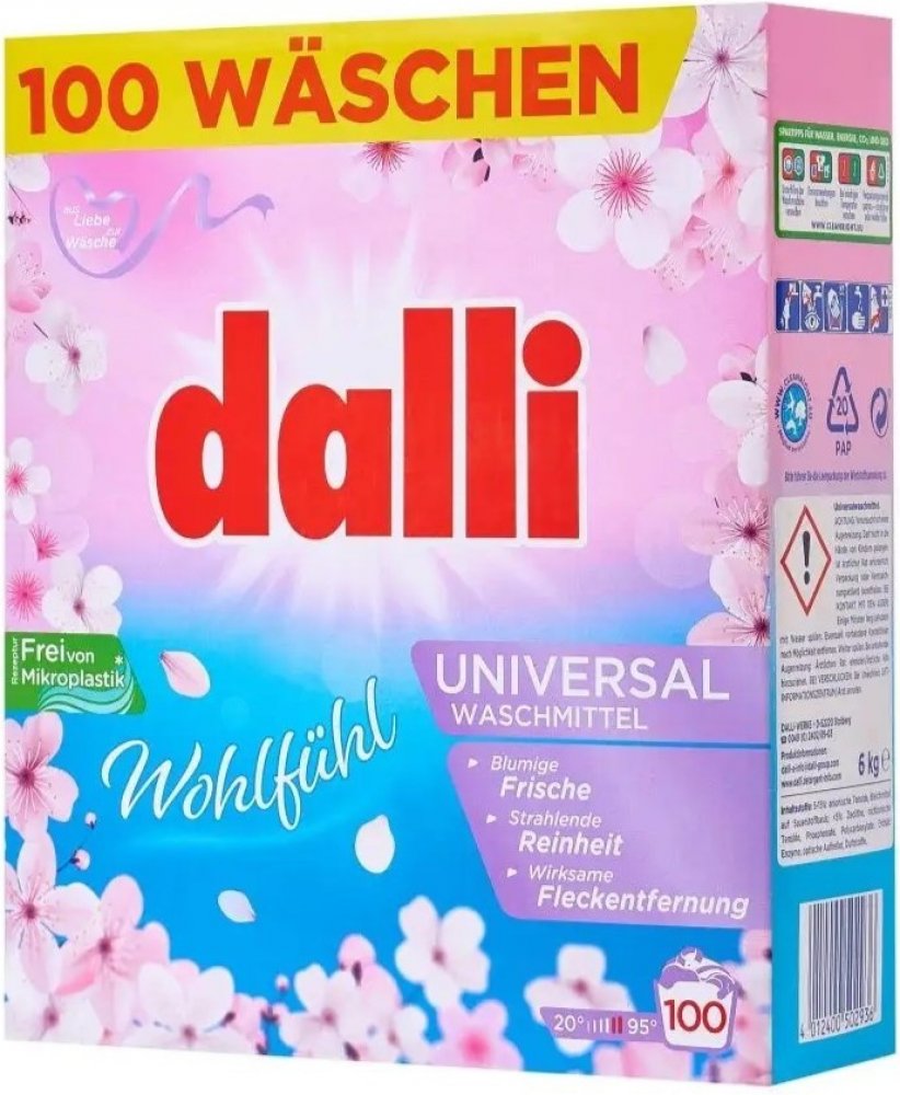 Dalli prací prášek Univerzal 100 dávek, 6 kg je praktické a úsporné řešení pro každodenní praní. Nabízí spolehlivý výkon při odstranění běžných nečistot a zachování svěžesti prádla, přičemž velké balení zajistí pohodlí a méně časté dokupování.