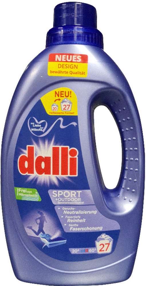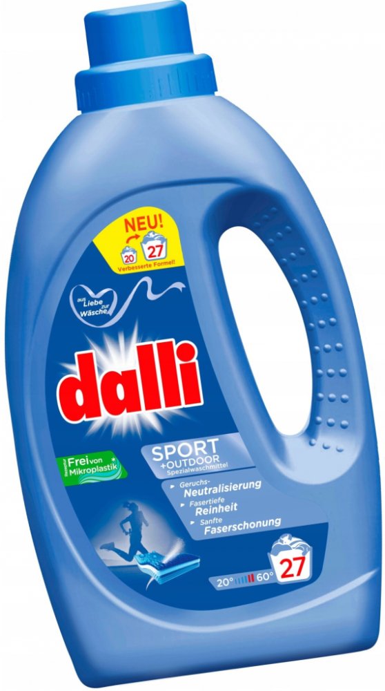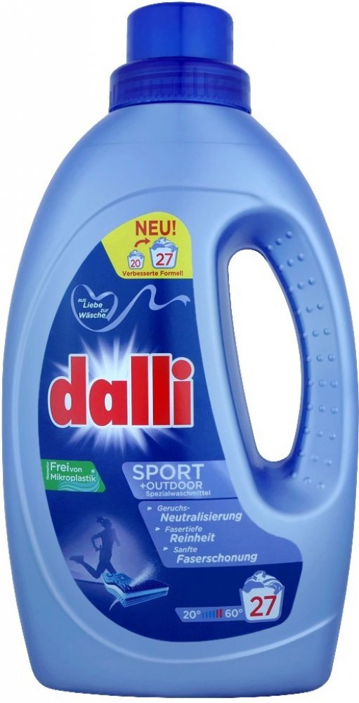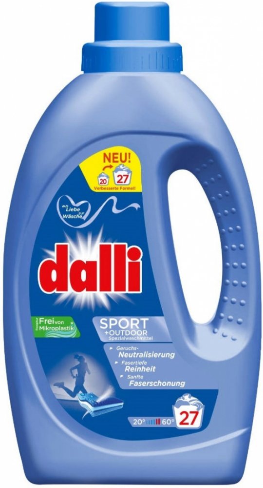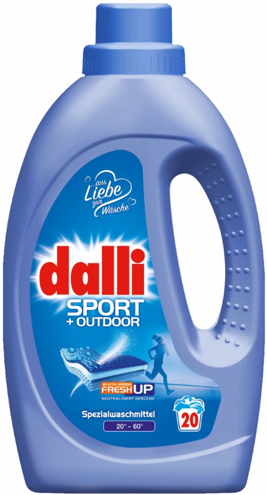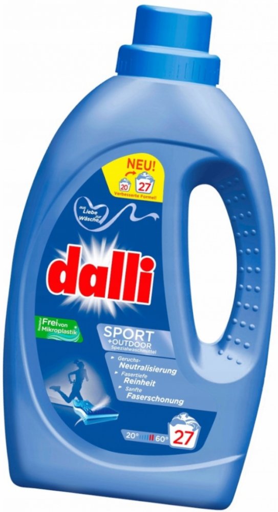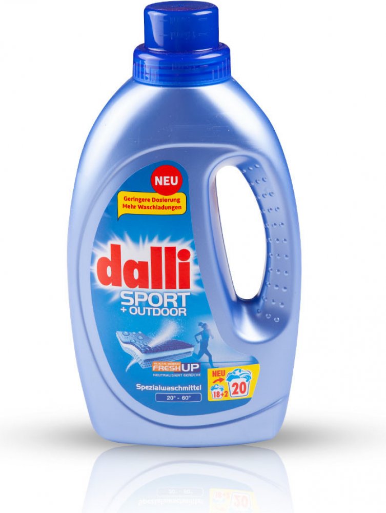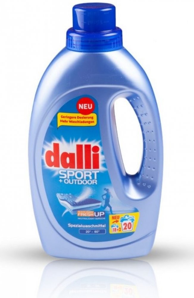 Dalli Sport + Outdoor Speciální prací gel 20 dávek, 1,1 l. Vhodný pro praní vláken jako je viskóza, elastan, mikrovlákno, polyester, stretch, směsové tkaniny a prodyšné sportovní oblečení a oblečení určené pro volný čas.