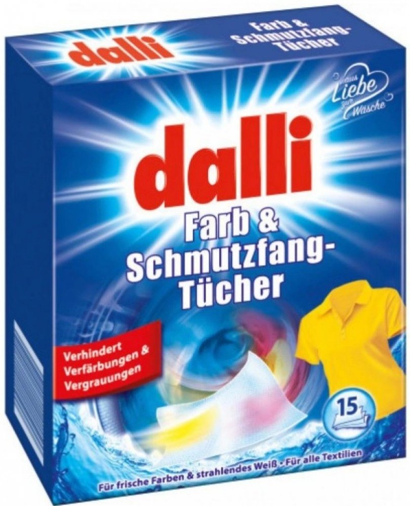 Ubrousky Dalli proti zabarvení zabraňují nežádoucímu zabarvení a zbytkům nečistot na textiliích během praní. Barviva/nečistoty rozpuštěné při praní jsou absorbovány přímo látkou v pěně a neusazují se již na jiných částech prádla.