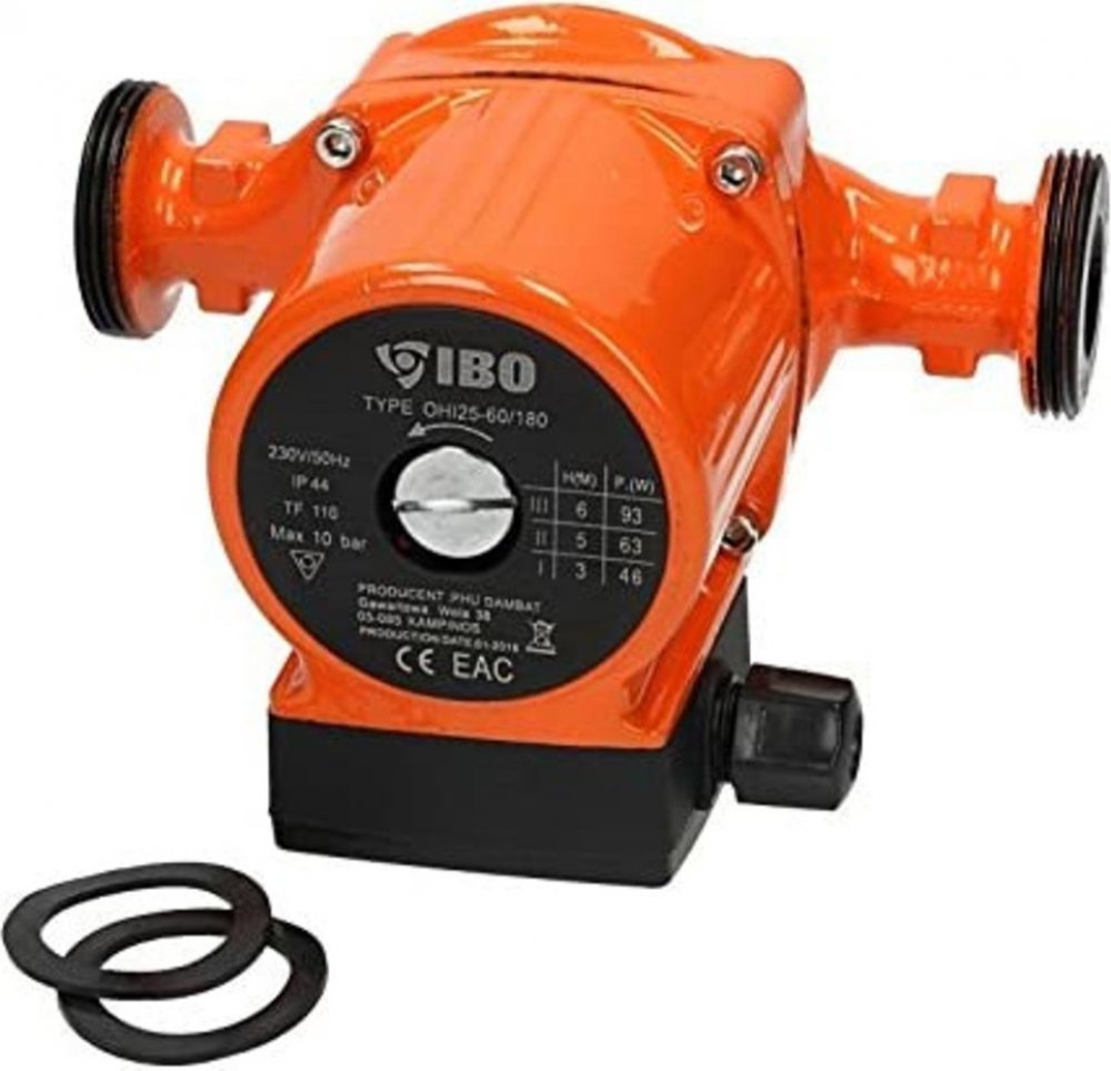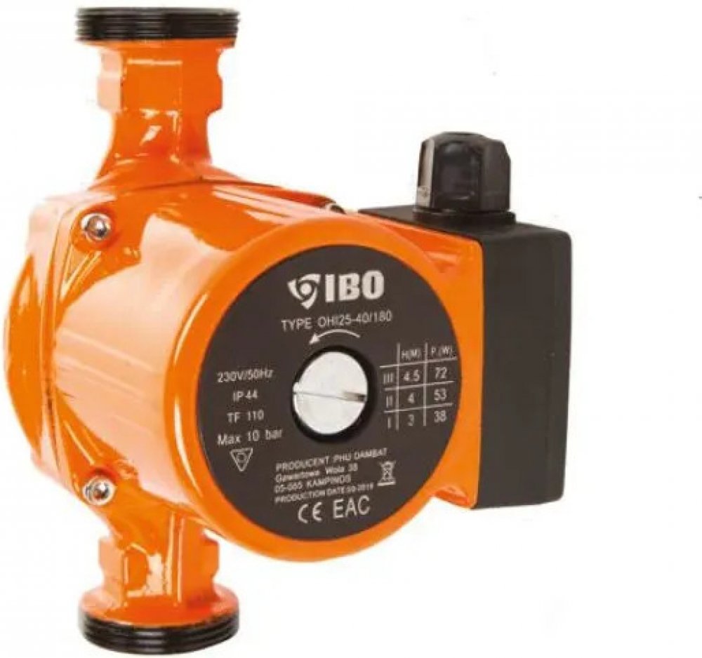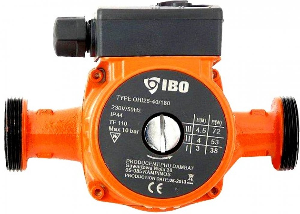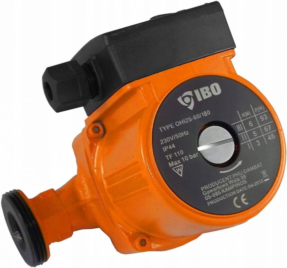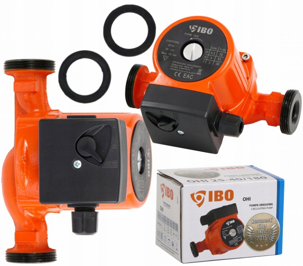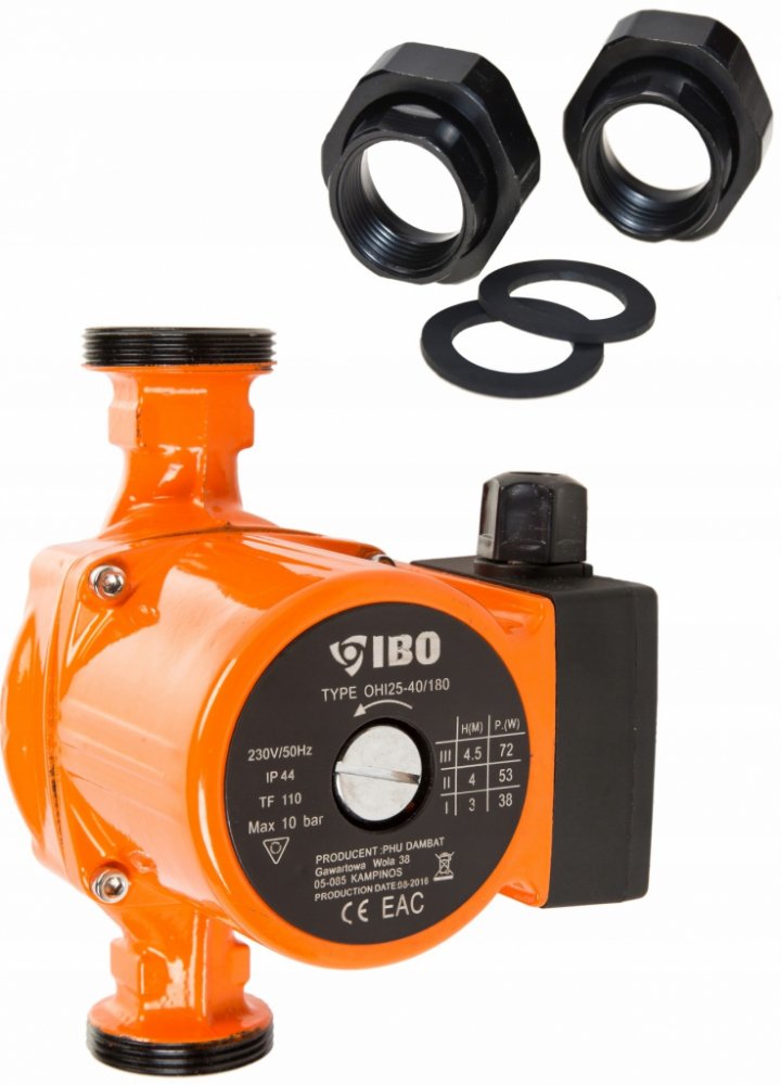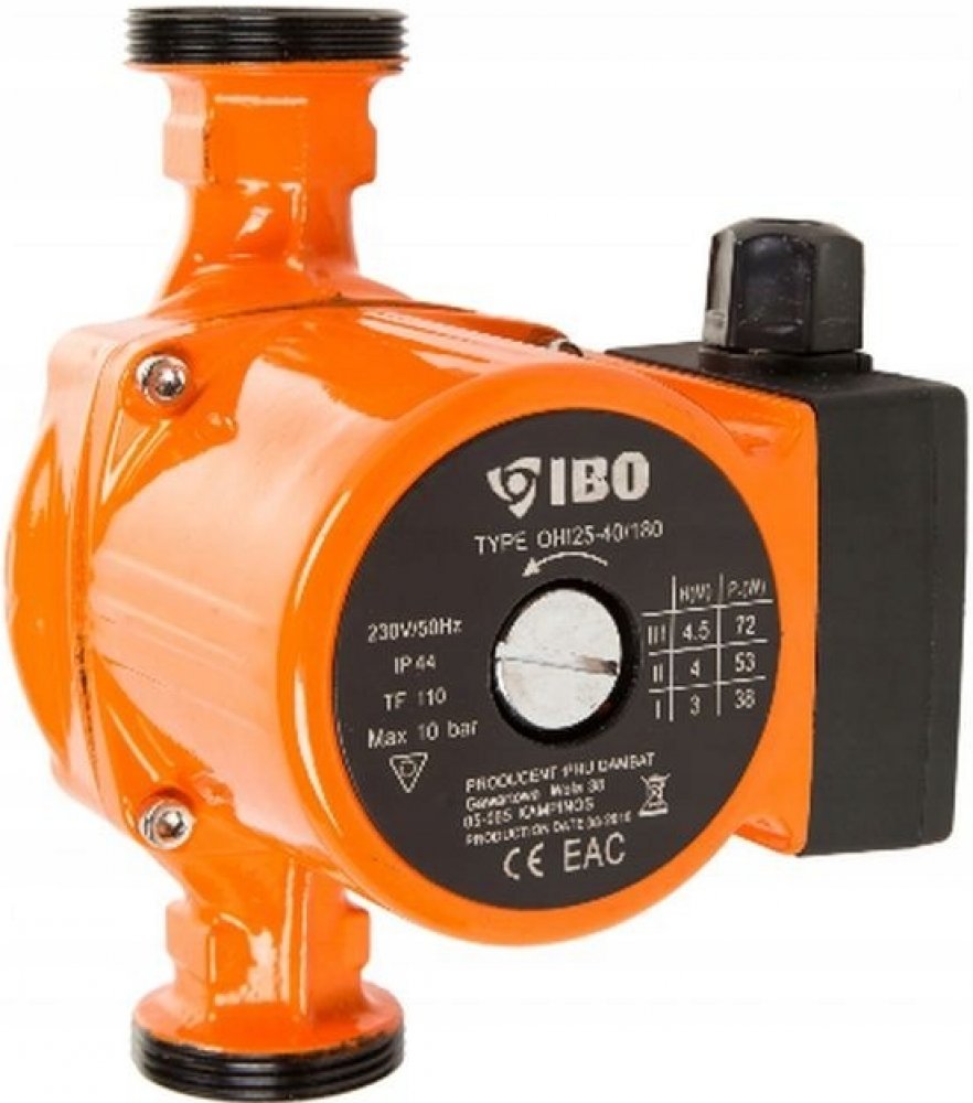 Oběhové čerpadlo IBO OHI 25-60/180mm je určeno k cirkulaci teplé vody, vody v systému ústředního vytápění, v solárních, klimatizačních a chladicích systémech. Čerpadlo je vybaveno přepínačem tří rychlostí mechanického otáčení rotoru motoru, čímž se zabezpečuje optimální spotřeba elektrické energie. Výhody oběhového čerpadla IBO OHI 25-60/180mm: úspora elektrické energie a paliva v kotli kompaktní rozměry jednoduchost použití a instalace dlouhý bezporuchový provoz materiály a díly jsou odolné vůči agresivnímu vodnímu prostředí a nevyžadují dodatečné náklady na údržbu konstrukce umožňuje oddělit řídící jednotku od čerpadla v případě poruchy nebo údržby tichý provoz i při vyšších rychlostech díky použitému materiálu ložiska Technické parametry: Materiál: litina, vrch. vrstva - antikorozní smalt Výkon na základě rýchlosti (1/2/3): 46 / 63 / 93 W Max. průtok na základě rychlosti (1/2/3): 22 / 38 / 55l / min Maximální výtlak (1/2/3): 3m / 5m / 6m Teplota média: 2–110 °C Maximální tlak v potrubí: 10 Bar Stupeň ochrany: IP44 Montážní délka: 180 mm