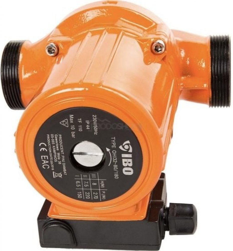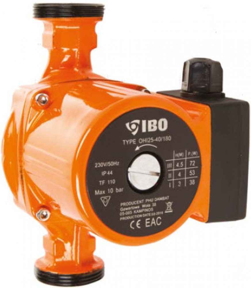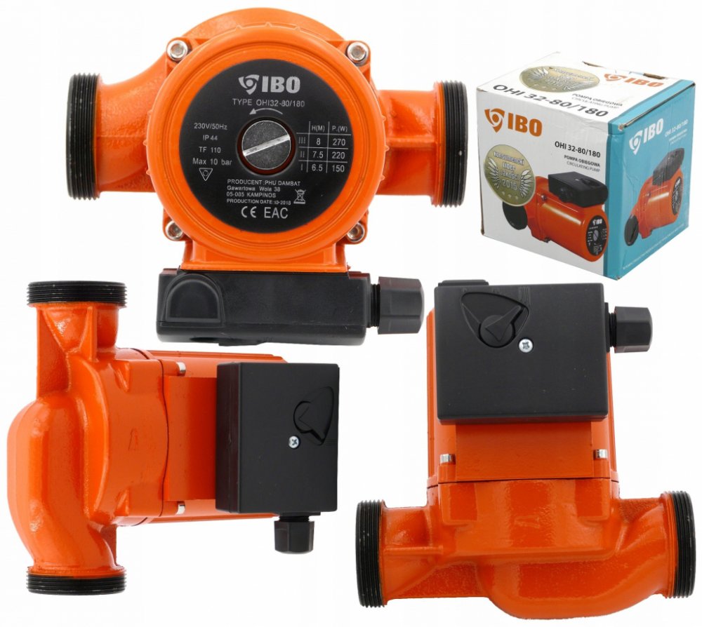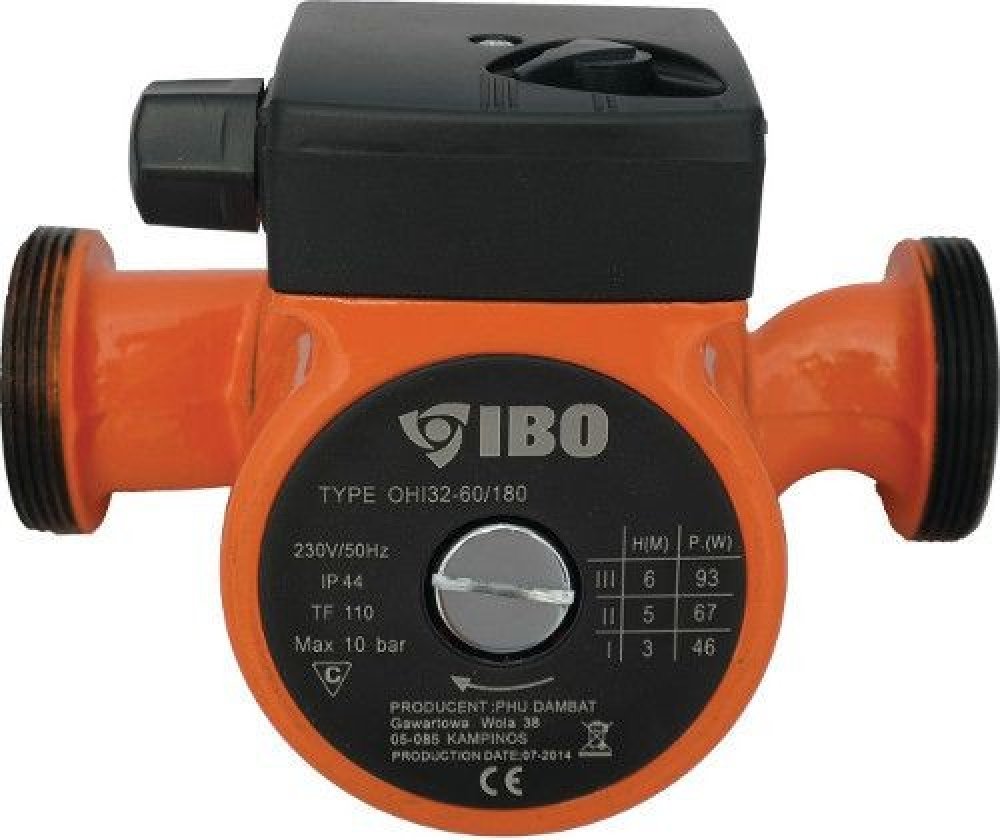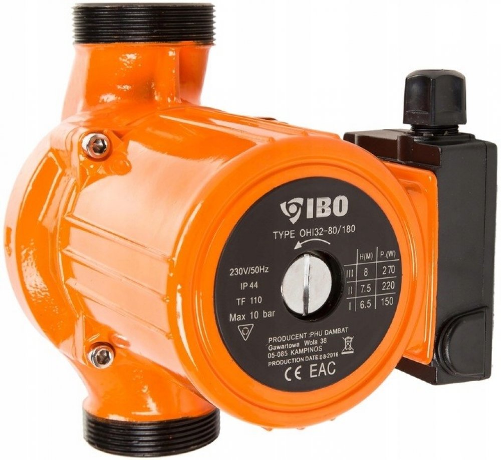 Oběhové čerpadlo IBO OHI 32-80/180mm je určeno k cirkulaci teplé vody, vody v systému ústředního vytápění, v solárních, klimatizačních a chladicích systémech. Čerpadlo je vybaveno přepínačem tří rychlostí mechanického otáčení rotoru motoru, čímž se zabezpečuje optimální spotřeba elektrické energie. Výhody oběhového čerpadla IBO OHI 32-80/180mm: úspora elektrické energie a paliva v kotli kompaktní rozměry jednoduchost použití a instalace dlouhý bezporuchový provoz materiály a díly jsou odolné vůči agresivnímu vodnímu prostředí a nevyžadují dodatečné náklady na údržbu konstrukce umožňuje oddělit řídící jednotku od čerpadla v případě poruchy nebo údržby tichý provoz i při vyšších rychlostech díky použitému materiálu ložiska Technické parametry: Materiál: litina, vrch. vrstva - antikorozní smalt Výkon na základě rýchlosti (1/2/3): 150 / 220 / 270 W Max. průtok na základě rychlosti (1/2/3): 43 / 103 / 160l / min Maximální výtlak (1/2/3): 6,5m / 7,5m / 8m Teplota média: 2–110 °C Maximální tlak v potrubí: 10 Bar Stupeň ochrany: IP44 Montážní délka: 180 mm