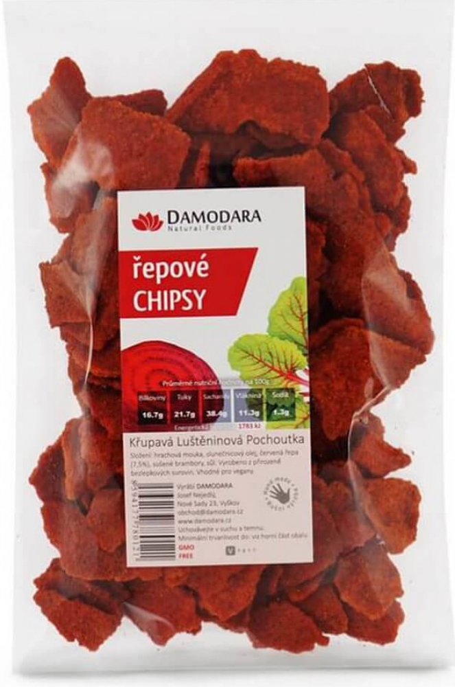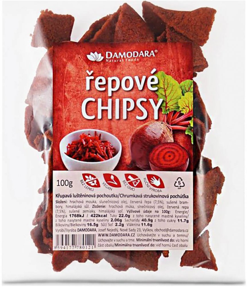 Luštěninové chipsy s červenou řepou Dodržovat režim zdravého stravování je náročné, je proto potřeba, abyste si dopřáli také trošku úlev a zdravého křoupání. Bez výčitek si večer otevřete zdravé chipsy se skvělou příchutí červené řepy, jejichž základ tvoří hrachová mouka a jsou proto skvělým řešením i pro ty z Vás, kteří držíte přísnou bezlepkovou dietu. Veganům můžeme skvělé křupky doporučit, při jejich výrobě se totiž živočišným produktům vyhýbali obloukem. Dopřejte si chvilku pro sebe a vypusťte přemýšlení o tom, co jíte a zda to v rámci svého zdravého dne jíst můžete. Řepové chipsy jsou tím nejlepším řešením, jak si pochutnat na mlsání a zároveň dodržet zdravou linii svého životního stylu. Složení Hrachová mouka, sušené brambory, červená řepa (10%), slunečnicový olej, sůl. Výživové údaje na 100 g Energie 1768 kJ / 422 kcal Tuky 22,0 g z toho nasycené mastné kyseliny 2,06 g Sacharidy 40,9 g z toho cukry 11,7 g Bílkoviny 16,5 g Vláknina 11,6 g Sůl 2,2 g Skladování Uchovávejte v suchu a temnu.