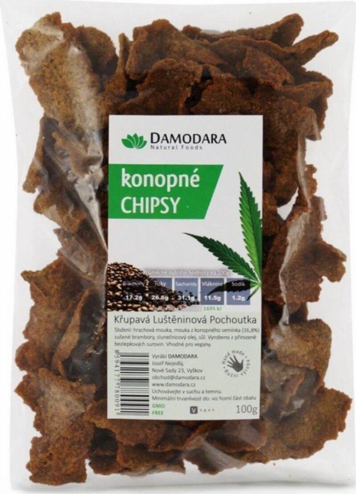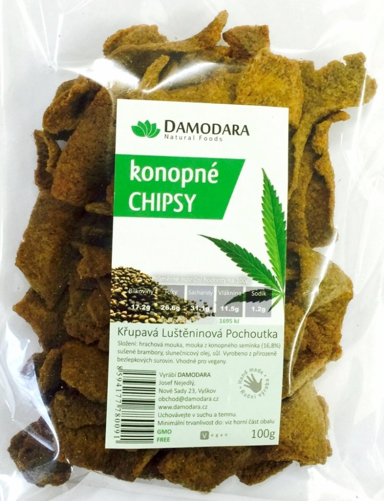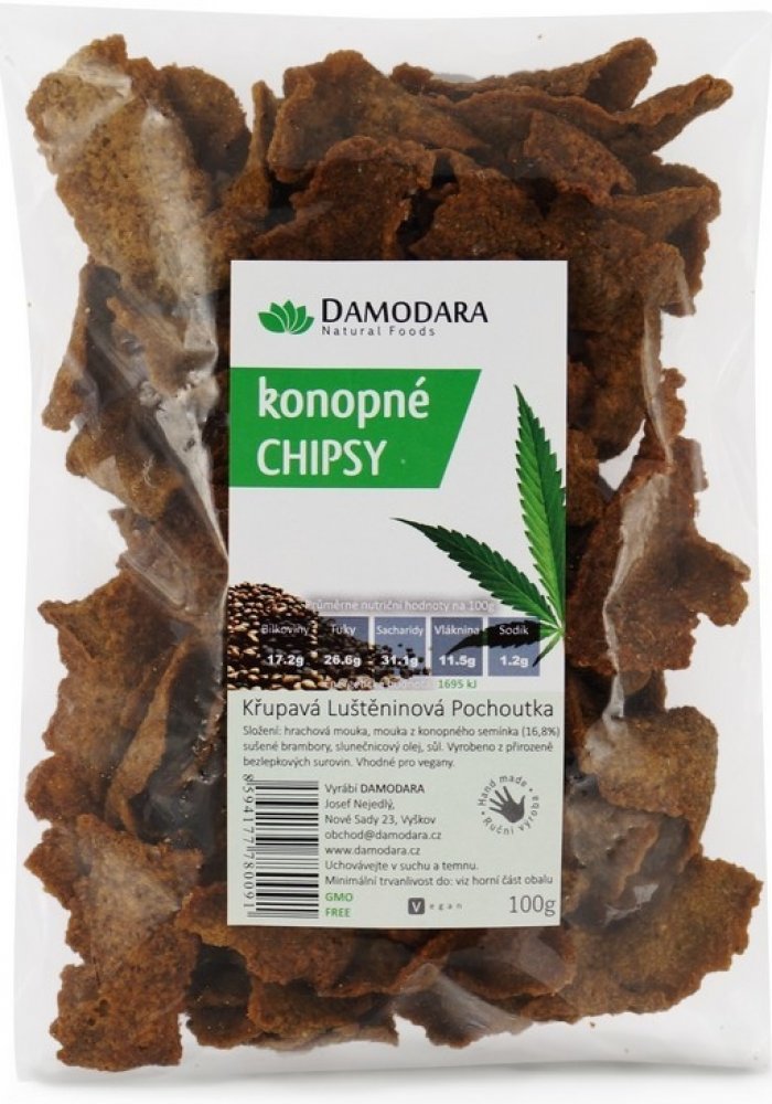 Chipsy s konopným semínkem Damodara - chipsy jsou zdravé luštěninové křupky vhodné taktéž pro vegany. Neobsahují žádné živočišné produkty ani jakékoliv přísady vyrobené za použití živočišných produktů, naopak jsou luštěniny výborným zdrojem rostlinných bílkovin. Bez konzervantů, umělých barviv, emulgátorů, ochucovadel či jiných umělých složek. Jsou vyrobeny výhradně z čistě přírodních surovin z přirozeně bezlepkových surovin.