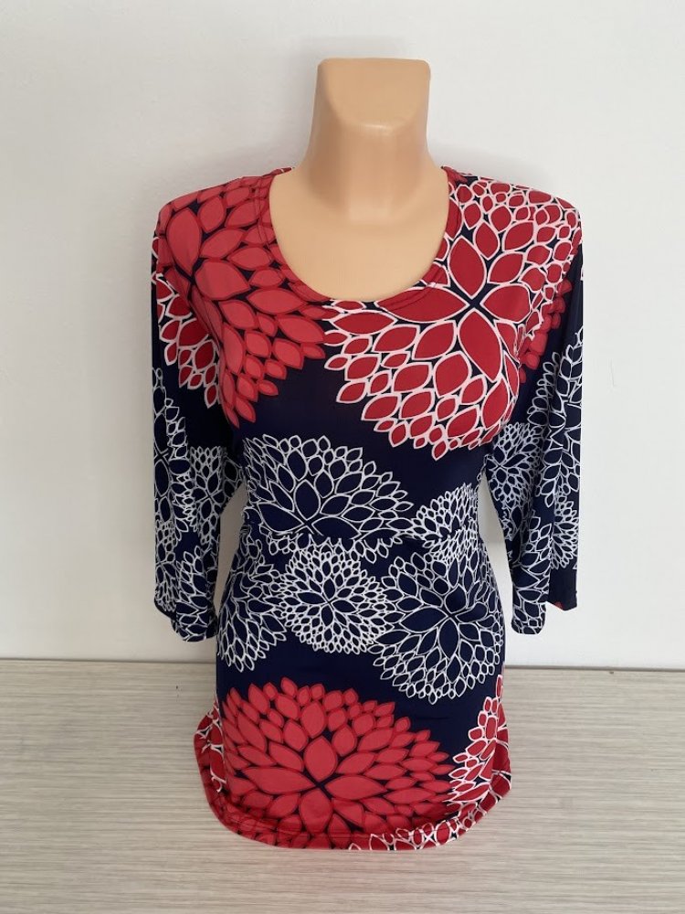 Červeno modrá halenka s velkými květy zaujme na první pohled. Můžete ji obdržet ve Vašem oblíbeném střihu a délce. Halenka je ušita z poplyesterového úpletu, který nevyžaduje téměř žádnou údržbu, vyvěsíte a můžete v ní zase hned vyjít.... Vzhledem k velkému vzoru není žádná halenka úplně stejná, každá bude originálem kvůli rozložení vzoru na halence.